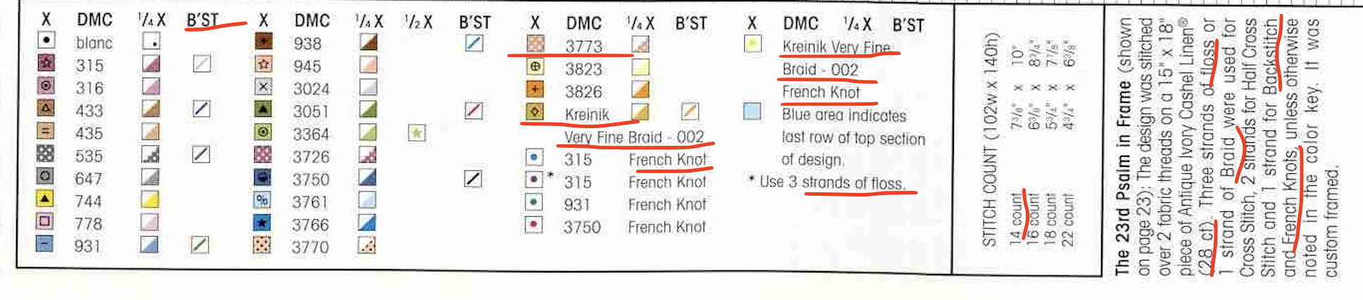 7 мая 2023 1 час назад, priyatnost_ сказал(а): Вы не могли бы, пожалуйста, кратко объяснить, в чем отличия?)) Буду очень благодарна за расшифровку не очень понятных для меня вещей в скриншоте (выделены красным);) 1 час назад, priyatnost_ сказал(а): B'st это бэкститч, контурный шов, стежок назад иголку, по разному называют. Он очерчивает контуры и вышивка выглядит более четкой. В вашем дизайне еще и весь текст вышивается этим швом. French Knot это французский узелок. Как делать оба этих стежка (бэкститч и фр. узелки) можно посмотреть в интернете. Есть много видеоуроков и в картинках. 14 count это каунт канвы, рекомендованный для этого дизайна. Ему соответствует 28 каунт равномерки. Кстати, вы какой каунт купили? На фото не видно . 3 strands of floss or 1 strand of braid - полные крестики вышиваются в три нити мулине или в одну нить Крейника. Полукрест вышивается в 2 нити, и в 1 нить вышивается бэкститч и фрузелки. Около каждого номера мулине слева значок для полного крестика, справа для 1/4 крестика и бэкститча. Но я смотрю на схему и не вижу 1/4 крестика, а вижу только только 3\4. Они используются чтобы сгладить контуры, чтобы не было "ступенек". 1/4 крестика используется только в глазах. WhiteMoth, priyatnost_ и JanaTX сказали спасибо Поделиться сообщением Ссылка на сообщение