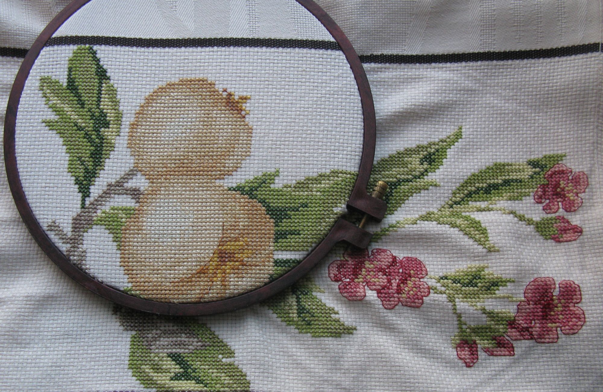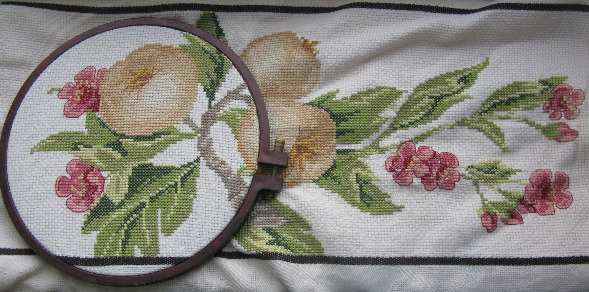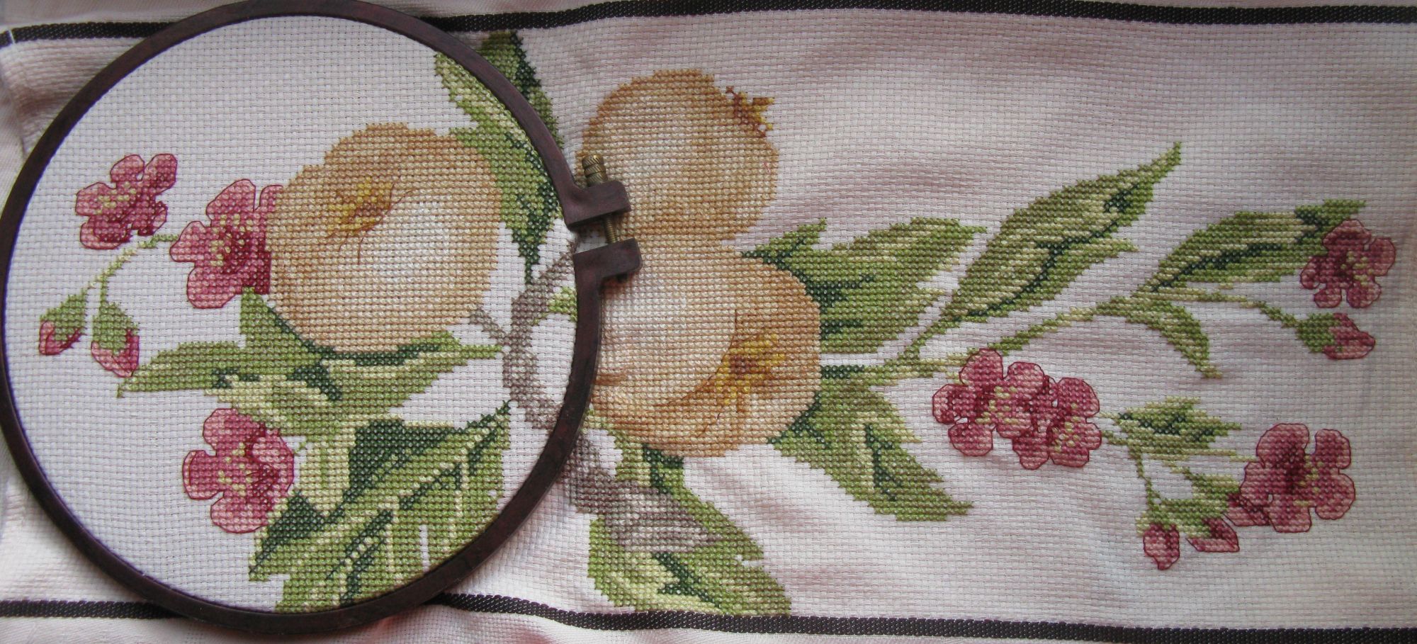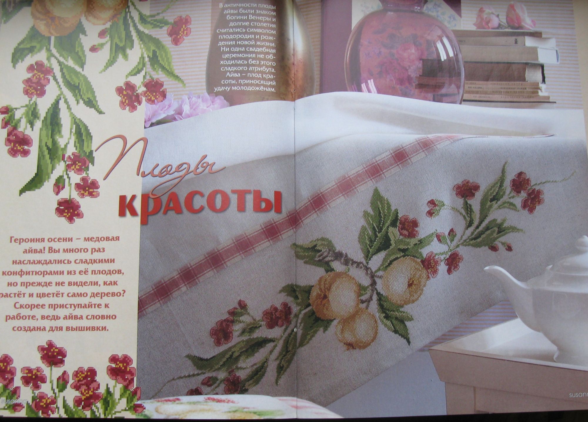 23 ноября 2019 Всем привет! ...я опять исчезла с форумных радаров)...не успеваю я за темпом событий...что ж ...приходится отказываться от любимых занятий... Сначала ушла с головой в вышивку,а потом, прикинув,что к дате Икс не успеваю, и совсем её забросила...думаю,будет ещё повод подарить её весной...не важно же к какому событию) Сейчас вроде интенсивность жизни приходит потихоньку в более-менее привычное русло...по крайней мере уже могу чуток повышивать...а иначе без релакса никак... Вот мои последние успехи с орхидеей Было/стало: А ещё помнится выклянчила у Татуси выложить незаконченный процесс...она к празднику проводила ликвидацию-замену вечно-красных гаек ...у меня таких нет,но с лета был закончен тайный процесс и так быстро подарен,что не успела сфотать в готовом отпаренном виде...а показать хочется...поэтому уж простите...покажу итоги в пяльцах...а уж воображения нам не занимать)) Итак, вышитое полотенце с цветущей и одновременно плодоносящей Айвой. Схема из журнала Susanna /рукоделие/ №5/12. Плоды красоты. Нитки гамма по ключу. Полотенце готовое,каунт11. Схема вся целиком не вместилась в заданный масштаб изделия...пришлось выдумывать сокращения. Вышивала потихоньку года два...теперь вот задумалась...ещё одно у меня полотенчико осталось))) Но пока ушла дошивать Орхидею) Всем отлично отдохнуть в выходные!..может и за пяльцами) Юнона1960, Хельга, Letto и 16 других сказали спасибо Поделиться сообщением Ссылка на сообщение