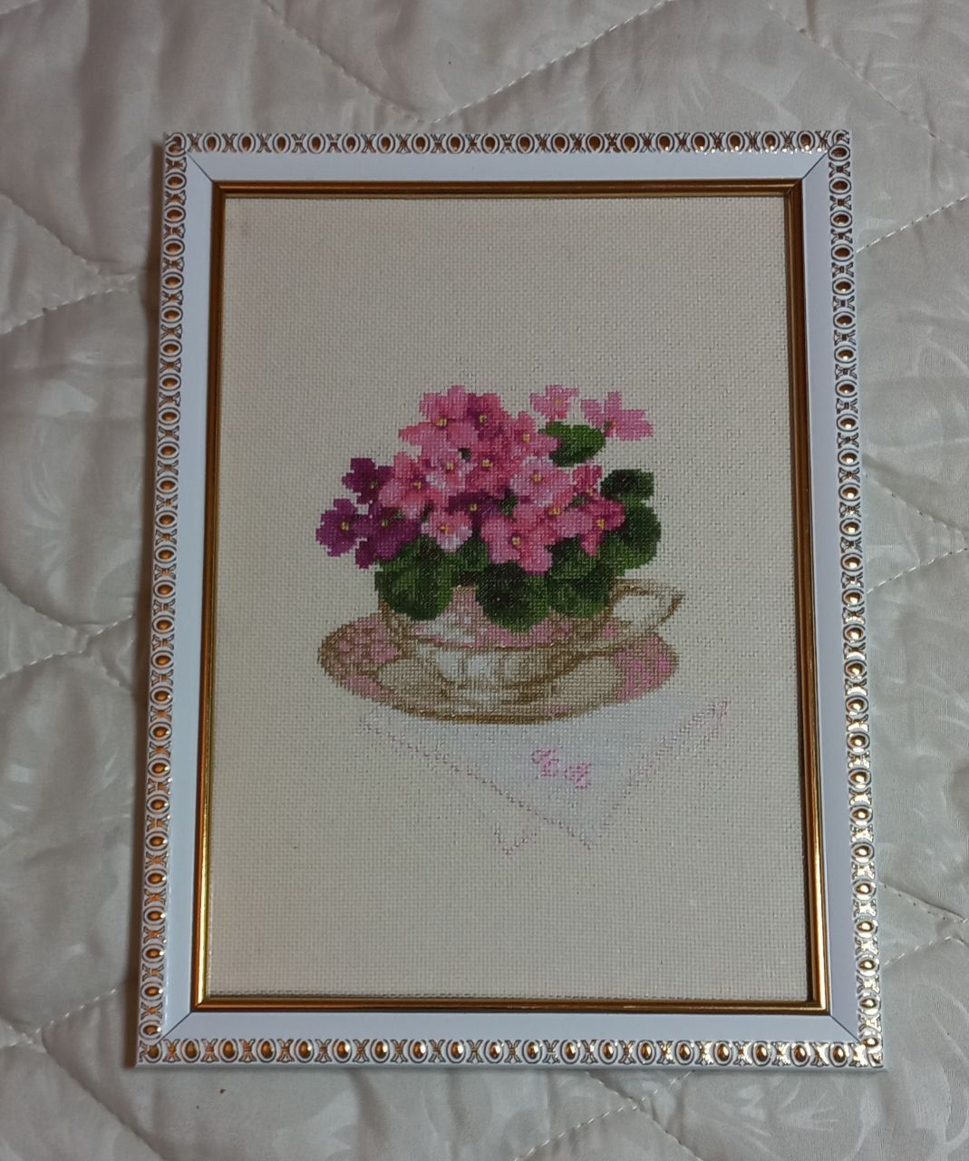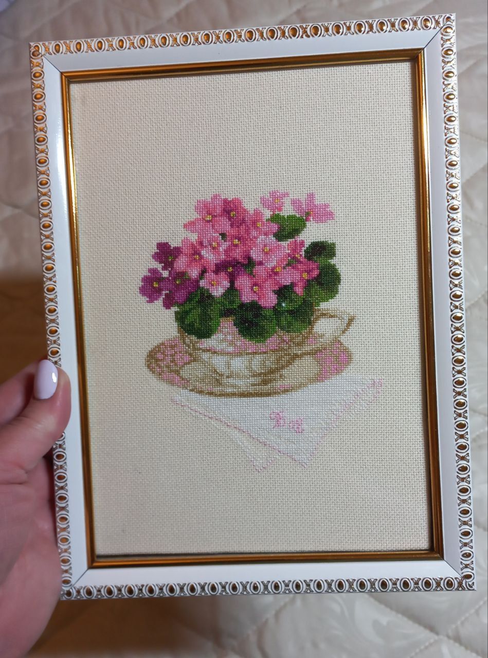 5 марта 2023 Плавно из разговоров предыдущего отчёта перетекаю в отчёт сегодняшний! Итак, Все в сад! Как все уже поняли, наверно, у моей фиалки хэппи энд! Успела вышить и оформить, очень красиво презентовала и, судя по вечернему полуторачасовому разговору с именинницей после вручения ей подарка, угодила прям на 100%)) С фотографиями всё сложно, так как днём не было возможности сфотографировать, а вечерние фото - грустные. Завершающее фото только такое, оказывается . Дальше я постирала и совсем забыла сфотографировать, сразу начала натягивать для оформления. Я неисправима по части фотографий Мне очень понравилось, как металлик здесь используют. Краешек ободка чашки вышивается им, а потом просто небольшие линии по краям ручки чашки и по контуру блюдца. Так ненавязчиво и в результате очень изящно! Я в восторге от этого. А вот чего не поняла и с чем категорически не согласилась даже, так это то, что металликом надо было вышить серединки цветов. Их я в результате вышила нитками, достаточно ярким жёлтым цветом. Поспорила с разработчиками и убрала из глаз своих фиалок этот холодный металлический блеск . Монограмма выглядит вот так: Так и не смогла лучше сфотографировать, поэтому покажу схему того, что там написано у меня): Оформила сама, в покупную рамочку. Для себя оформила бы совсем не так, но, зная человека, для которого готовила подарок, и учитывая повод, выбрала именно эту. Никак не получалось передать цвет без бликов (оставила стекло в рамке), поэтому в конце концов пришлось держать в руке. И вот что пошло дополнением к подарку. И покажу всё же, как я его упаковывала, это тоже красиво получилось)). Еще открытка конечно же была, с длинным весёлым письмом, забыла с ней сфотографировать, ну додумайте её)) Мы тут, на форуме, не сказать, что привыкли к таким сюрпризам друг от друга, но понимаем уже что это за эмоции. Моей сотруднице всё это было вновь и она просто взахлёб мне их описывала вечером, а я была просто счастлива, что поделилась этим прекрасным состоянием еще с одним человеком, это, пожалуй, и была главная цель моего подарка. Ну а теперь я возвращаюсь к своим прежним работам. Маяк и танцоры. Вся предыдущая неделя была очень суетная, сначала готовила подарок, потом собрание школьное было, потом еще вечерние поездки по делам. В общем, ни поговорить не успела ни с кем на форуме, ни повышивать. Вот что за сегодня сделала, открываем новую гайку. Чарлстон. Волшебная страна. После фиалки очень смешно вышивать)). Такое впечатление, что я топором машу)). Дерево, после такой деликатной равномерки, да еще и крестики просто гигантскими кажутся)). Произвольная программа у меня сегодня в двух частях: оконная и поделочная. К сожалению то, что хотела показать в оконном разделе, не получилось, поэтому покажу просто сегодняшнюю метель... А показать хотела вид из окна, которое выходит на третью сторону дома, из него видна церковь, но видна всё хуже и хуже с каждым годом, так как она далеко, а деревья разрастаются и постепенно её совсем закроют. Вот сейчас, пока листьев нет, я и хотела показать её, но погода пасмурная и купол не горит золотом, а без этого его совсем не видно, так что метель.... Ух ты! У меня случайно получилось панорамное фото)), только сейчас заметила, кога рядом обе фотографии разместила)). Квартира угловая, вот вид из двух окон. А поделочная часть - это моя очередная 