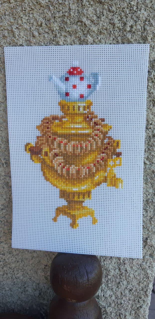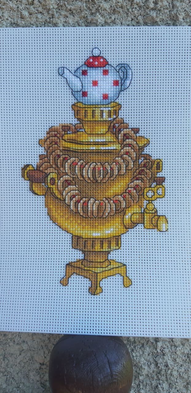 21 июля 2021 Всем привет! Пожалуй, напишу, потому как набралось всё же всякого-разного)). У меня сейчас начался непростой период, после, страшно сказать скольких лет, а именно 27 (!) работы на одном месте. Наши рабочие дела стали настолько плохи, что мы закрываем свою организацию, не справились мы с последними кризисами и пандемийным застоем. Это больно, тяжело во всех аспектах и, как оказалось, депрессивно. Дело осложняется в разы тем, что мы с мужем там работали вместе, муж один из учредителей и вот идет всё прахом. Остались без работы одновременно. Шоковое состояние, честно говоря.... Не пишется мне по этой причине в ваших темах, девчонки, уж простите меня. Но человек так устроен, видимо, что не может долго пребывать в унынии по такому поводу и у него случаются всплески надежды и даже что-то похоже на хорошее настроение)), воспользовавшись как раз вот таким своим состоянием решила написать в своей темке)). Итак, я продвинулась в своих процессах и вглубь и вширь)). Живой огонь, небольшое совсем прибавление, но вполне заметное, чтобы стать очередным этапом в процессе, поэтому показываю: По прежнему всем довольна, сложностей никаких нет, ниточки Мадейра просто обожаю! Цветопередача не очень, но если приглядеться, то можно уже заметить травку, тёмно-зеленый цвет пошел, в нижнем углу правом. О нём читала, что может не хватить ниток, так что стараюсь экономить, хотя я в принципе привыкла экономить нитки всегда в наборах. Уезжала я к сестре на пару недель, так что принесла самовар, как и обещала)). Готова первая сторона. Намеренно не вышивала банку с вареньем и чашку, они мне сразу не глянулись, меня интересовал только самовар с баранками. Так что по моим меркам я вышила ровно половину набора. Немного помучили соблазны - закрыть фетром оборотную часть и посчитать работу готовой, но совсем немного я поколебалась, всё же решила вышить целиком и потом попробовать сделать самовар немного объёмным. И вышила еще миниатюрку с мельницей Алисы. Работа совсем крохотная, за пару подходов была готова, процесс даже и не фотографировала. Оформила в готовую рамку. Вышивала для старшего сына, впервые попробовав согласовать свой посыл мирозданию с правильным расположением планет. С сыном мы увиделись в прошлые выходные, я ему показала мельницу, он ровным голосом её похвалил) и я спросила, как можно равнодушнее: возьмёшь? . К моему огромному удивлению, он сразу согласился, только попросил как-то сделать, чтобы она стояла на столе. Кузнецам мужу было дало задание, и подставочка была тотчас же готова))). Так что очередное моё произведение искусства творение уехало к сыну). Я прям рада-рада! Ну и не удержалась я от нового бисерного процесса. Как мне нравятся эти наборы Волшебной Страны просто не передать словами!))) Начала с чайника с лавандой. Балдёжный процесс! Красота и качество, я бы такой слоган порекомендовала "Волшебной стране")) И вот так нехитро у меня организован процесс). Пробовала небольшие контейнеры под бисер, даже купила что-то типа палитры маленькой, но неудобно мне, так и вернулась к суровым кучкам) Как я уже написала, гостила у сестры. В этом году сад совершенно не такой эффектный, как в прошлое лето, роз погибло очень много, да и вообще все цветы какие-то мелкие по сравнению с прошлым годом. Но всё же немного зарисовок наскребла. И дурында Котя)). Удивительное создание в с