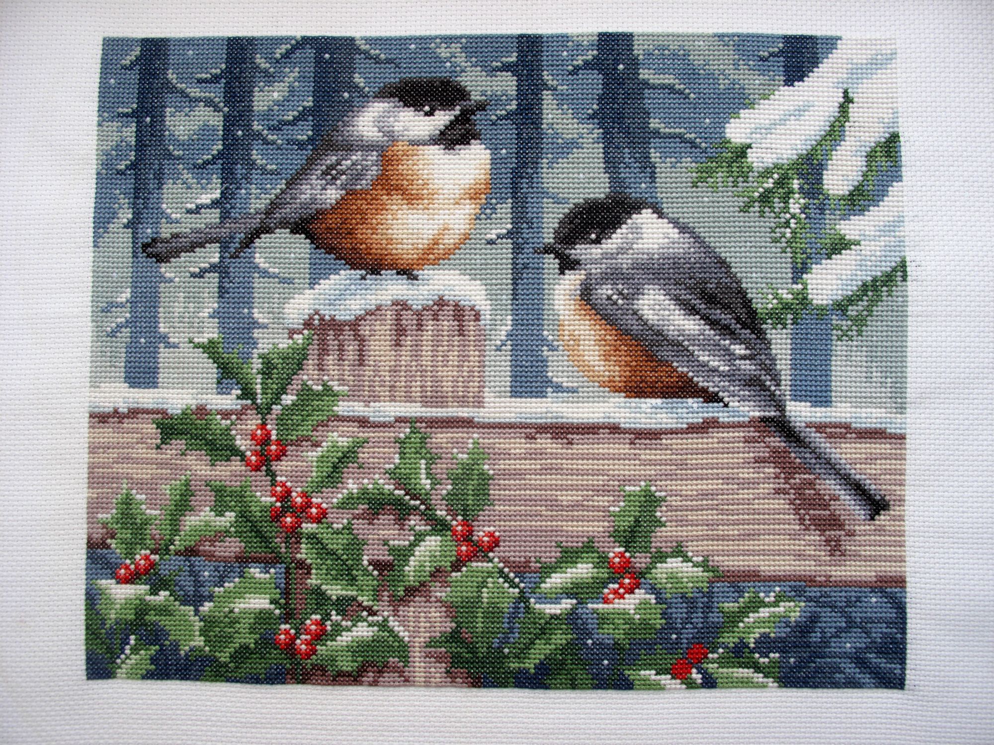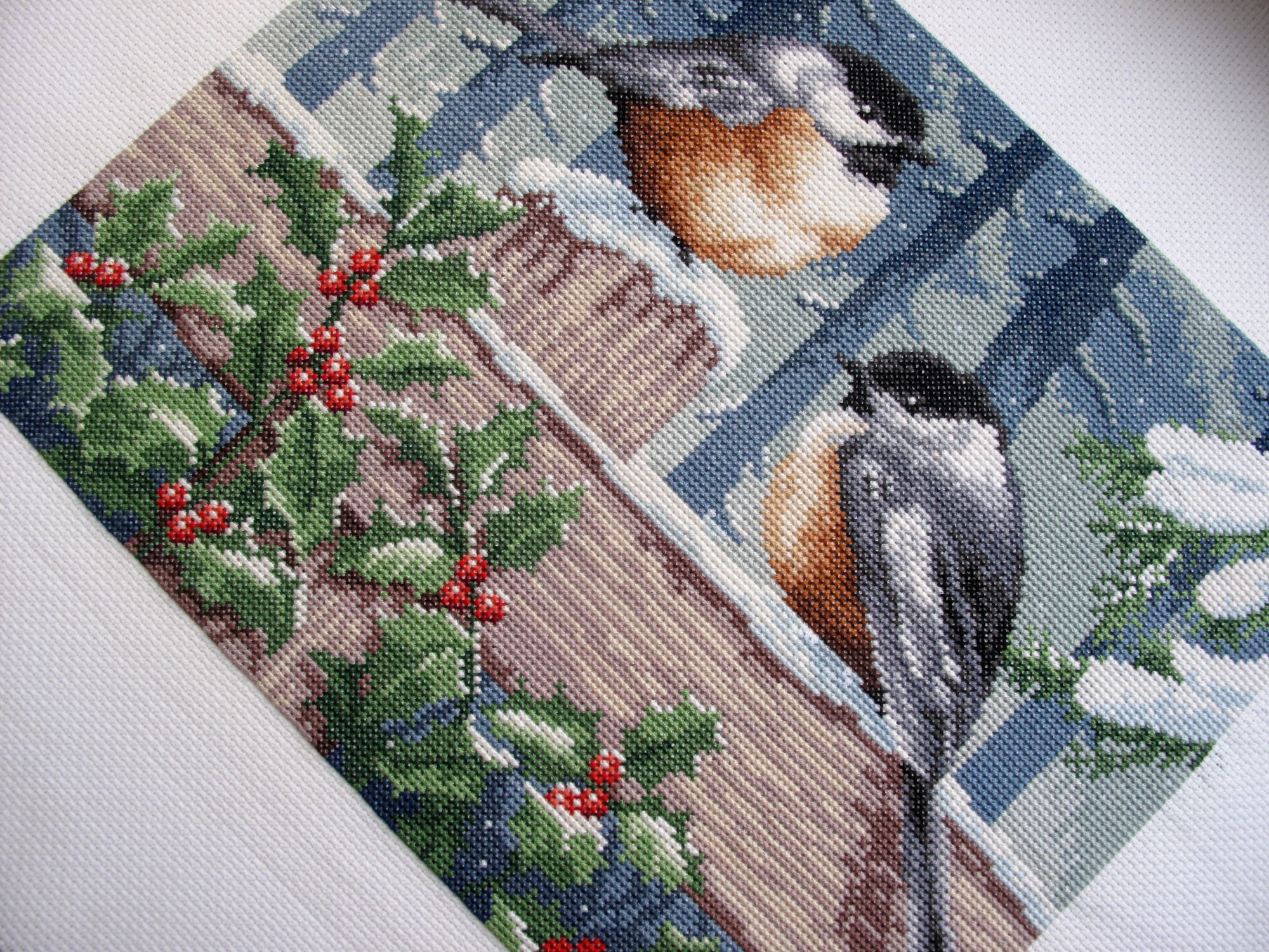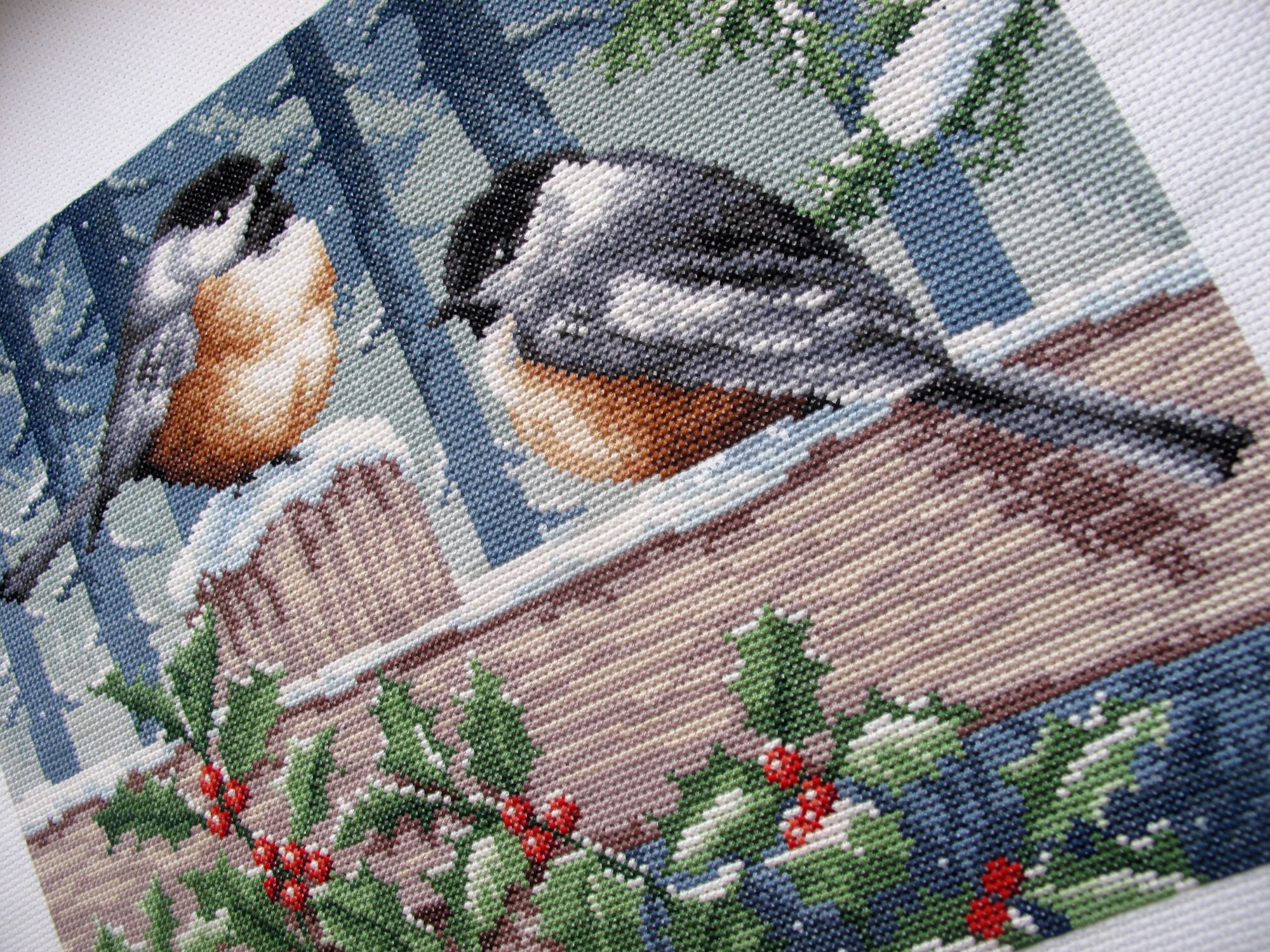 17 марта 2019 Девочки, привет! Наконец-то домучила своих чудо-синичек, радости нет конца и края, потому как теперь работу можно созерцать в уже законченном виде. Но при этом есть какое-то странное ощущение, когда есть легкая грустинка от того, что работа готова. Знаю, что звучит по меньшей мере странно, но как есть))) Теперь поделюсь своими впечатлениями и выводами, которые были мною сделаны в процессе отшива данного процесса. Резюме на работу Winter Tits "Зимние синицы" от производителя "Vervaco" (Бельгия): 1. Размер готовой работы согласно описания производителя 29*23 см, размер реальной работы получился с небольшим отклонением 28,3*23 см, по какой причине для меня остается загадкой. 2. Нитки хлопковые мулине DMC 30 цветов, в процессе вели себя послушно, ни один из представленных оттенков ниток не капризничал - не лохматился, не рвался и не перетирался. По окончании процесса ниточек осталось много. Кроме основных оттенков в работе блэндов не было. Единственный момент, который меня смутил при вскрытии набора, это то, что несколько пасм ниток были завязаны узлами как встречается у производителей невысокой ценовой категории. При распутывании некоторые пасмы поделились на два небольших отреза, в другом же случае часть ниточек пришлось просто выбросить за невозможностью использования. Это действительно очень удивило, и удивило неприятно. При такой ценовой категории наборов, такие оплошности не допустимы. Но… потрясающий результат и приятные ощущения от процесса давно перекрыли этот небольшой осадок от комплектации набора. 3. Канва Аида 14 белого цвета очень плотная и средней жесткости, в связи с чем вероятность деформации крестиков небольшая, что является несомненным плюсом. Поэтому значительное отличие размера реальной работы от заявленного совершенно не понятно. 4. Схема черно-белая символьная на матовой бумаге, несложная. Символы достаточно крупные, не схожие друг с другом. Из всех черно-белых схем, которыми я пользовалась, эта самая удобная и приятная глазу. Символы очень разные, четкие. Правда есть два, которые между собой сливаются, но фрагментов, в которых они используются мало. Схема представлена на одном огромном листе, она очень легко и приятно читается. Чтоб было понимание почему размер схемы все-таки огромный, а не просто большой, уточню это 64*49 см, больше самой работы. На обратной стороне схемы есть инструкция на нескольких языках, включая русский, в которой расписаны рекомендации по вышиванию и последующему уходу за уже вышитой работой (стирка, глажка). 5. Техника вышивания - счетный крест в 2 нити, ни полукреста, ни бэка, ни фрузелочков, поэтому уровень сложности работы оцениваю как легкий. 6. Одиночные крестики присутствуют в небольшом количестве, а также групп по два, три и четыре крестика в работе тоже не много, потому процесс вышивки очень комфортный. 7. Оригинал по яркости не отличается от заявленной на обложке фотографии, цветовая палитра ниток очень яркая и насыщенная, от чего в живую вышивка выглядит сочно и красочно. Работа очень насыщенная в цветовом решении. Как итог, могу отметить очень милый, очаровательный, хорошо проработанный дизайн. Впечатления от работы однозначно самые положительные, вышивалась с интересом и непередаваемым удовольствием. Очень надеюсь, что данный краткий обзор поможет кому-то при отшиве если не данного конкр