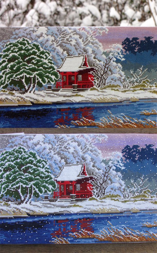 3 декабря 2020 Почитала про снежинки, подумала что уместным дополнением будет вот такой материал. Когда решали каким дизайну быть, была у меня ещё задумка насчёт центрального шара. Хотелось к такой новогодней теме прицепить что ни будь блестященькое - сделать дуги металликом, снежинки стеклярусом. По моей просьбе вышивальщица в процессе отшива сделала несколько дуг. Результат не понравился от слова совсем. Сразу пропал объём и стало понятно, что украшательства здесь не нужны. Фото этих проб прикладываю, заодно и свои рабочие пробы. Пока бисер по готовой работе не раскидаешь( с фру узелками сложнее), не понятно какой эффект это даст. В качестве примера принесла другую работу( с производства она снята). Фото сделаны в разное время и при разном освещении, поэтому цветом отличаются. В оригинале по которому делался дизайн( один из немногих, сделанных по чужому исходнику, я по возможности стараюсь сделать как можно ближе к оригиналу, ведь художник хотел донести что то своё особенное и мне не нравится это переиначивать) снежинки есть, и мне это очень нравилось, но в процессе работы мне предложили отказаться от снежинок, поскольку это был мой второй дизайн, отсутствие опыта не позволило мне сориентироваться самостоятельно в этом вопросе. Дизайн вышел без снежинок. Дизайн мне понравился, и я его вышила для себя, по ходу поэкспериментировала с отшивом, на берегу у меня там местами идёт крест с разной верхней и нижней нитью, немного изменила небо и добавила снежинок бисером. Уже не первый год я смотрю на эту вышивку и не могу понять, какой вариант мне больше нравится. Там где нет бисера, есть глубина и прозрачность. Там где есть бисер, появляется ощущение уютности. Один дизайн, а вот впечатление совсем разное. Снежинки в дизайне «Театральное волшебство» вот так же могут украсть объём, но добавить уюта. Поэкспериментировать с этим можно, но уже на индивидуальном уровне, благо это не сложно))) Может бисер взять не белый, а серебристый. Ещё можно взять бисер одного цвета, но разного размера, тоже интересный эффект. Вообщем появился момент для личного творчества))) Толика, Сибирская Кошка, murzopyat и 30 других сказали спасибо Поделиться сообщением Ссылка на сообщение
