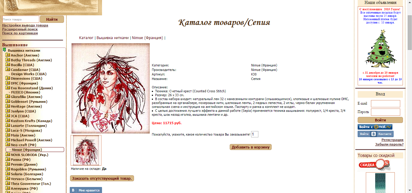 2 января 2015 Здравствуйте! Ямана (Ольга), Алиса в Стране Чудес (Татьяна), monica (Татьяна), Natik_V (Наталья) пожалуйста, приведите примеры , где цены на фирму Dimensions на нашем сайте выше 4 тыс. руб. Пожалуйста, дайте конкретные ссылки. Если вы ориентируетесь на данный ресурс сравнения цен, то иногда информация бывает не верна! Сейчас у нас представлена только 1 работа фирмы Dimensions свыше 4 тыс. руб.: 71-09148 Набор для вышивания Элегантный Амариллис (Elegant Amaryllis)- 4229 руб. - подушка гобелен. http://iskusnitsa.ru/catalogue/item-29938/ Если Вы найдете хотя бы один набор для вышивания этой фирмы стоимостью свыше 4 тыс. руб. на нашем сайте, кроме набора 71-09148 и готовых вышитых работ, то мы обещаем бесплатно выслать этот набор в подарок! Данное предложение действует до 11-01-15. А вы молодцы )) Когда я писала свой пост, димовский набор Сказка 35319 стоил 4248 руб. а сейчас вы снизили цену и пишете "Дайте ссылку". ОК, в следующий раз буду умнее и буду делать скрины )) Lena_Dm, Алиса в Стране Чудес, belenaniv и 3 других сказали спасибо Поделиться сообщением Ссылка на сообщение