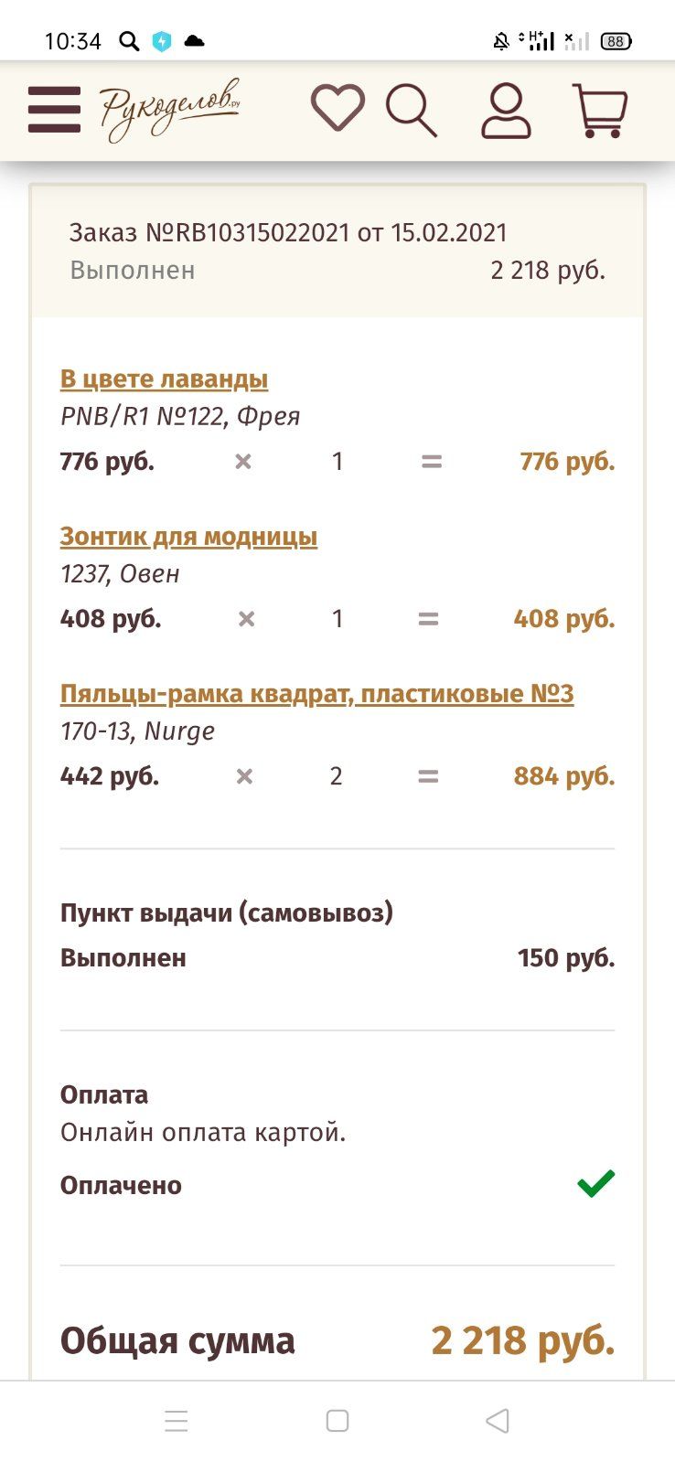 1 марта 2021 1 час назад, Rukodelov.Ru сказал(а): Добрый день! Уточните пожалуйста номер Вашего заказа, мы проверим статус заказа. Добрый вечер. Номер RB10324022021. У меня в личном кабинете статус "в очереди на сбор". Поделиться сообщением Ссылка на сообщение