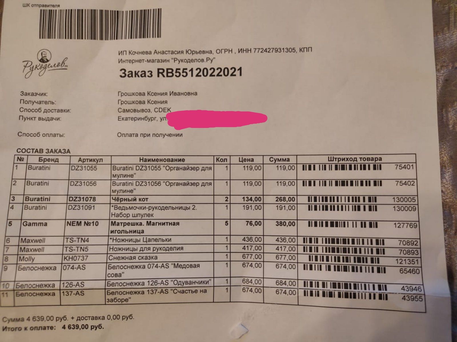 12 февраля 2021 Девочки,напишу и в эту тему и в тему Боксберри.Обращайте внимание на состояние заказа,его упаковки.Вчера получала заказ в ПВЗ,оператор на выдаче обратила внимание на подозрительный вид посылки.Я торопилась,схватила и хотела уходить,но после этого замечания решила проверить.Одна половина клапана была не приклеена.Внутри вместо трех наборов милл хилл ....всего один.Даже нити Титан нет,как нет и двух наборов.Заказ был оплачен. Я не хочу предполагать на каком этапе это произошло.Я просто прошу вас быть внимательными и всегда стараться проверять заказ. P.S.Спасибо оператору магазина Рукоделов Светлане за сочувствие,понимание меня,как покупателя,и желание помочь! Novia, makalicha1970, Lena_Dm и 7 других сказали спасибо Поделиться сообщением Ссылка на сообщение