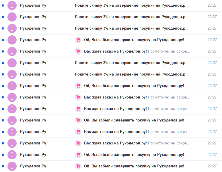 13 ноября 2019 У кого-нибудь есть глюк от Рукоделова с рассылкой почтовой? Оставила в корзине товар несколько дней назад, теперь за 10 минут более 90 писем с напоминанием о неоформленном заказе Горшочек, не вари Уффф... полечилось удалением из корзины товара Lara2808, kseniya_te, -Solovey- и 1 другой сказали спасибо Поделиться сообщением Ссылка на сообщение