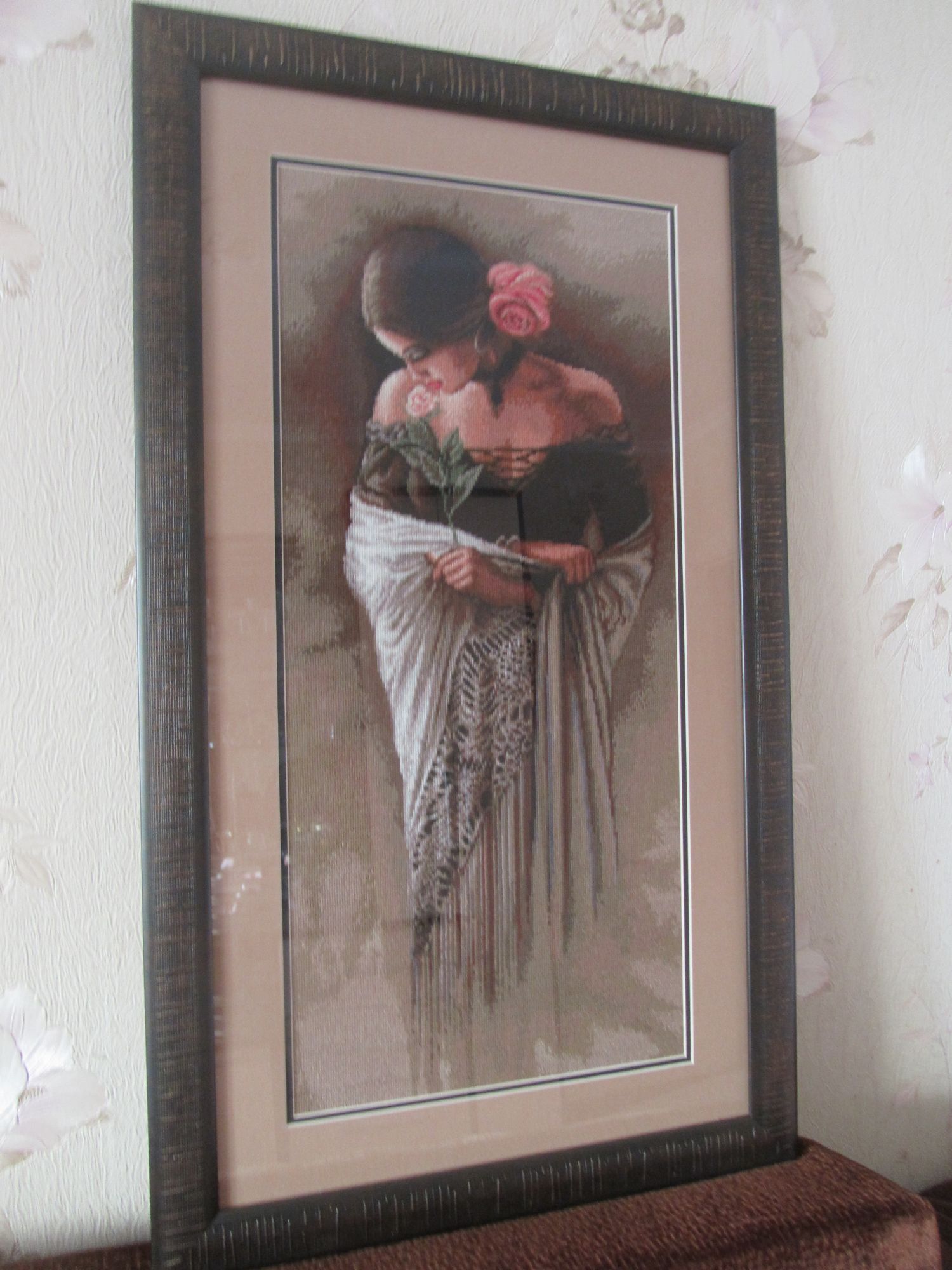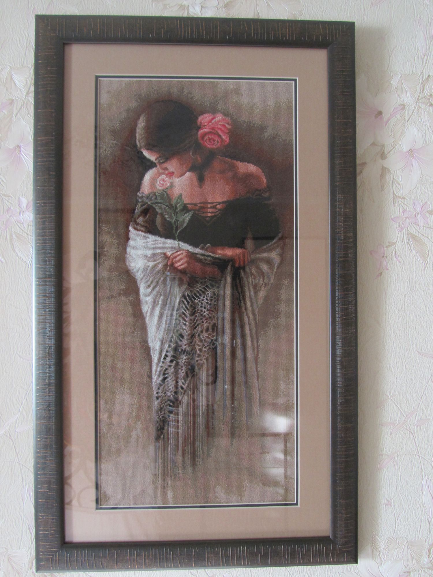 7 ноября 2019 Всем привет! Я позавчера отнесла испанку в багетку, а вчера она уже оказалась готовой, сегодня ее забрала смотрите что получилось. Стекло обычное, двойное паспарту(внутреннее черного цвета) рама темно-коричневая с золотистыми рисками. Подарок невестке, у них будет висеть картина не на свету, надеюсь ничего в ней отображаться не будет, если что поменяю стекло на антибликовое, но боюсь картина потеряет яркость. TheSunniestDay, Natashik1978, ЛАДОМИРА и 25 других сказали спасибо Поделиться сообщением Ссылка на сообщение