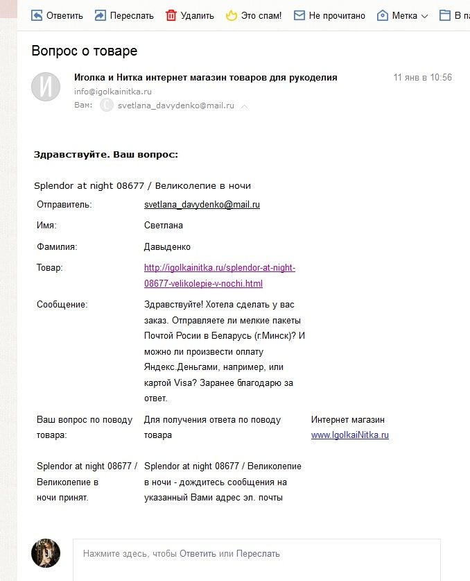 31 января 2018 23 часа назад, Svetlana D сказал: Здравствуйте, Татьяна! Вопросы свои я задавала на Вашем сайте через шаблон обратной связи "свяжитесь с нами": 11 января и где-то через неделю после того. В первый раз (11 января) мне даже посчастливилось получить автоматическое уведомление на e-mail о том, что я отправила вопрос в магазин. И, чтобы не быть голословной, прилагаю его скрин: Добрый вечер! Светлана, благодарю Вас за ответ и за наглядный скрин страницы с вопросом по заказу набора. Вы писали на эл.ящик info@igolkainitka.ru, а наша основная работающая почта igolkainitka@mail.ru ( но не все об этом знают! ). Обычно , если клиент пишет на первый адрес, то все вопросы или сообщения дублируются на второй. В этот раз , по какой-то неизвестной причине, этого не произошло. Проверим, исправим! Вы нас извините за данную нелепую ситуацию, не увидели, ошибка наша. Светлана, пишу Вам на будущее ( небольшие рекомендации ) , а также всем гостям, клиентам, заказчикам : если вы не получили ответа на свое письмо через эл.почту info@igolkainitka.ru, то смело дублируйте ваш вопрос на другой , точно действующий и работающий ящик igolkainitka@mail.ru ( на странице магазина в разделе Информация указаны оба ящика ). Здесь вы точно получите ответ на интересующий Вас вопрос. Всем спасибо за внимание! Svetl@n@ и AssOlka сказали спасибо Поделиться сообщением Ссылка на сообщение