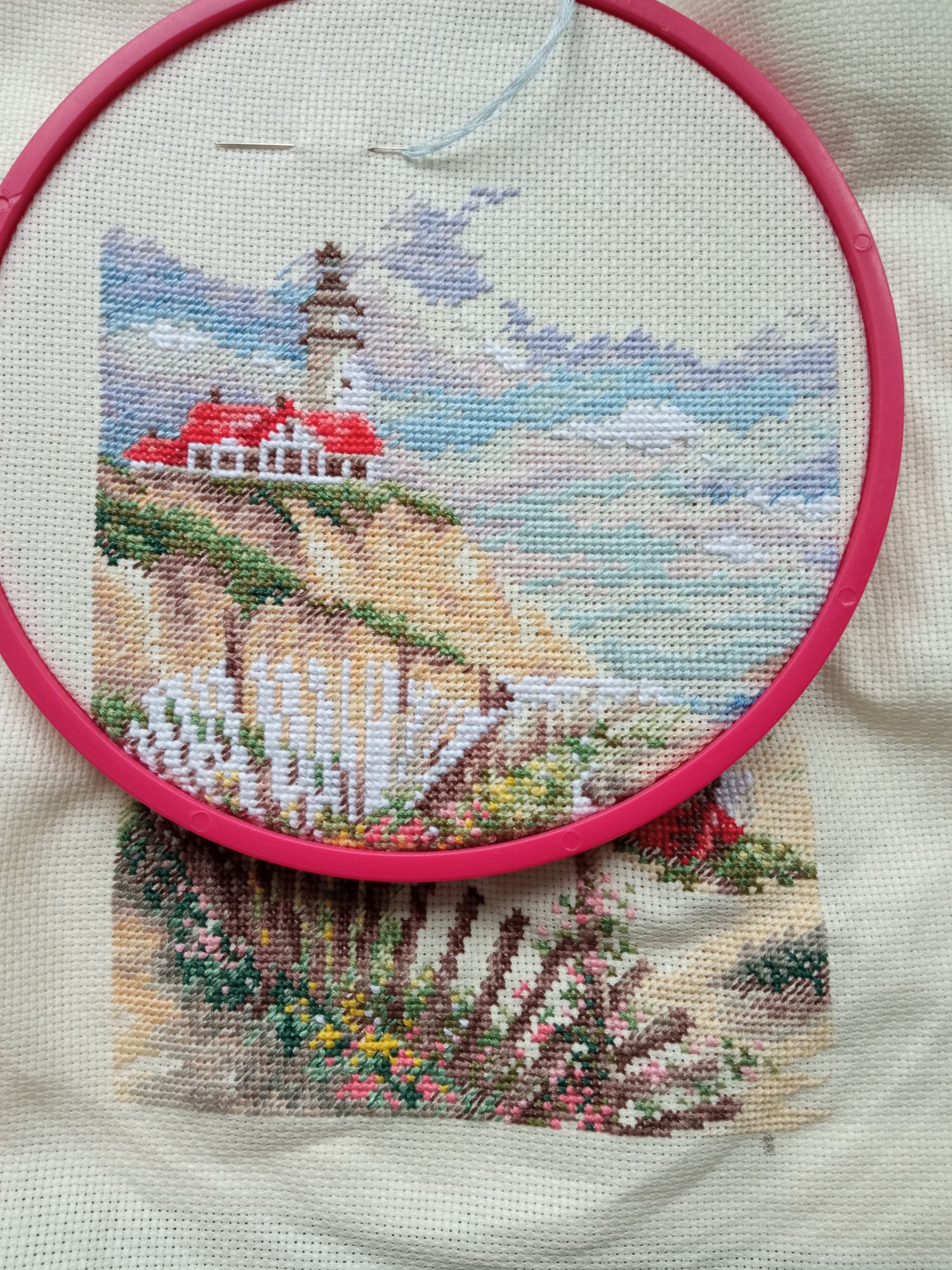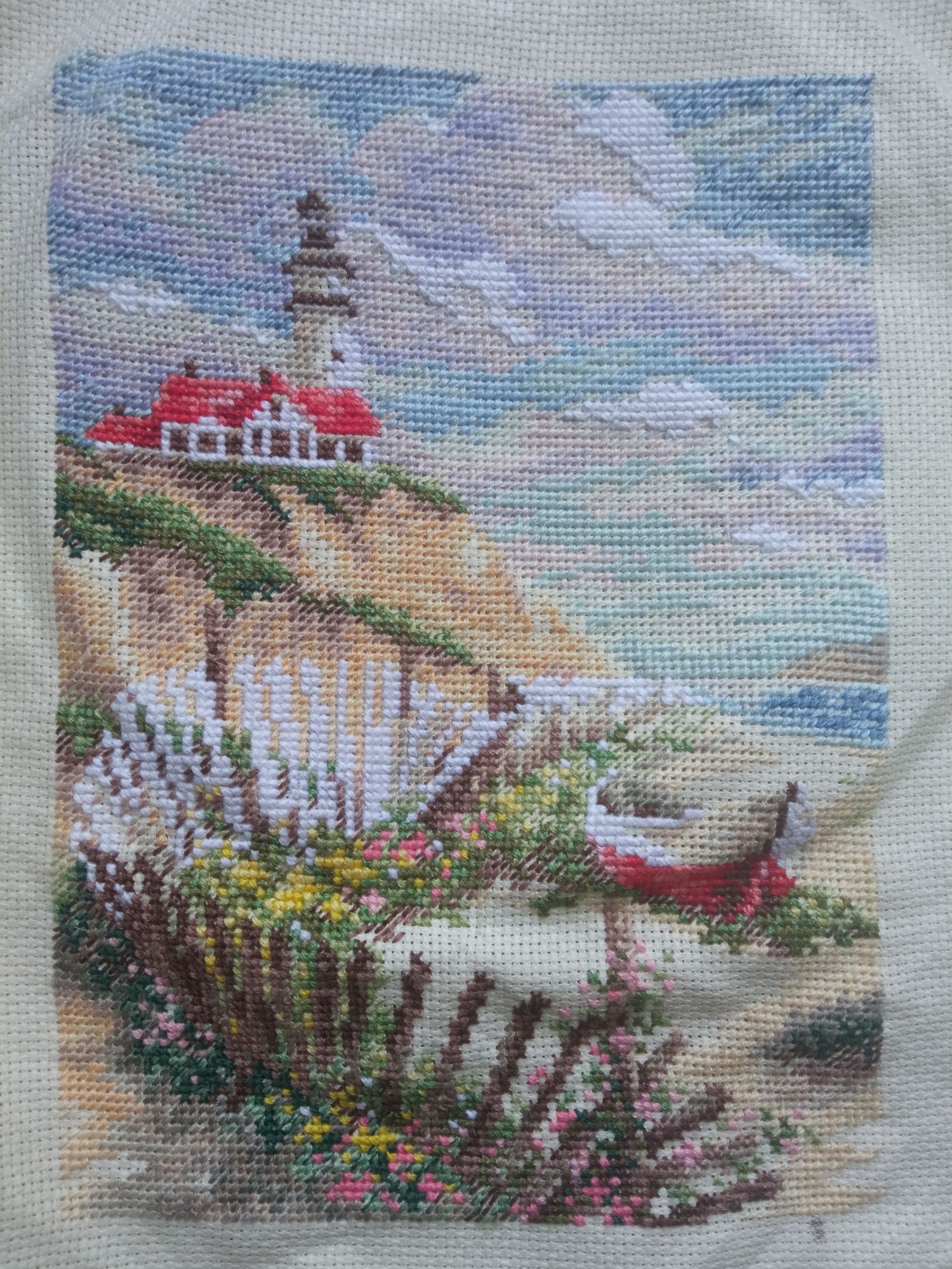 19 августа 2021 Валя, Юля, Таня, спасибо вам огромное!) 4 часа назад, Egelia сказал(а): Нравится мне этот кривой заборчик. Какой то особай шарм он придает сюжету. Не по фен-шую))) вот несколько раз натыкалась на такие отзывы - что нравится сюжет, но вот не по фен-шую))) А по мне (как здесь где-то прочла) у нас где что поместилось, там и фен-шуй Да и вообще, заметила - не люблю "фен-шуйные" сюжеты. Слишком они какие-то гладенькие, прилизанные, чрезмерно идеальные... не жизненные, в общем. И очень-очень скучные... А вот когда есть покосившийся заборчик - это необычно, это интересно! Когда есть грозовое небо и штормовое море (как в Бегущих по волнам, например) - это борьба со стихией, это экспрессия, это энергия! Это жизнь!!! И вот это мне по душе 54 минуты назад, Juliay сказал(а): Ух ты! Оля, как быстро! Уже и красавец маяк нарисован! Молодец!!!! 42 минуты назад, Аринесса сказал(а): С продвижением ,Оля. Отдохни на небе и легкого тебе бэка. Просто пока есть побольше времени ; ещё раз убеждаюсь, что это основополагающе! Никакая сага, никакой перенабор не ускорит процесс, если нет времени! Так что пока есть возможность - "выжимаю по-максимуму" А вот и небо появляется. Если до него я как-то сомневалась в том, что вижу, то сейчас всё начинает вставать на свои места. Утренняя свежесть, кучевые облака (не быть ли дождю?)) и чудесная атмосфера Небо вышиваю по бумажной схеме, сложностей здесь действительно нет. И интересный момент - во всём этом дизайне белым цветом вышивается в 3 нити полным крестом. И это на 18 Аиде. Интересная дизайнерская находка, хоть и не очень простая в исполнении (протягивать 3 нити через дырочки аиды не так легко). Но зато итог - объëмные элементы. Хочу поскорее дойти до облаков и посмотреть, как оно будет смотреться в итоге. Kattrielle, Snow, Путешественница и 14 других сказали спасибо Поделиться сообщением Ссылка на сообщение