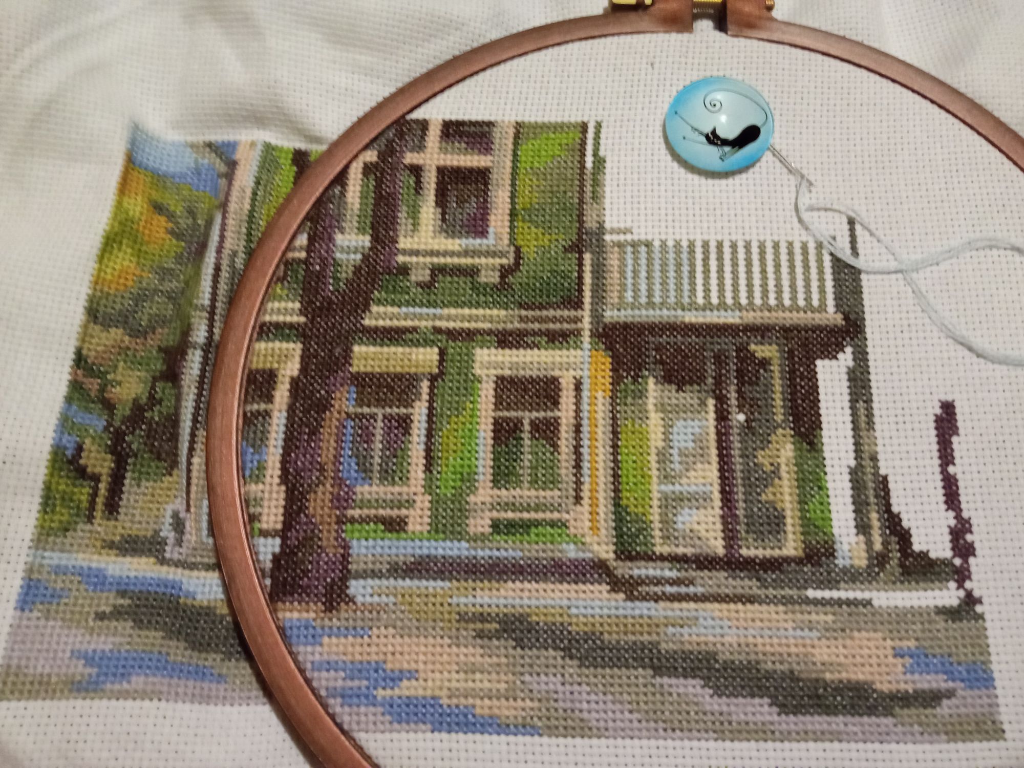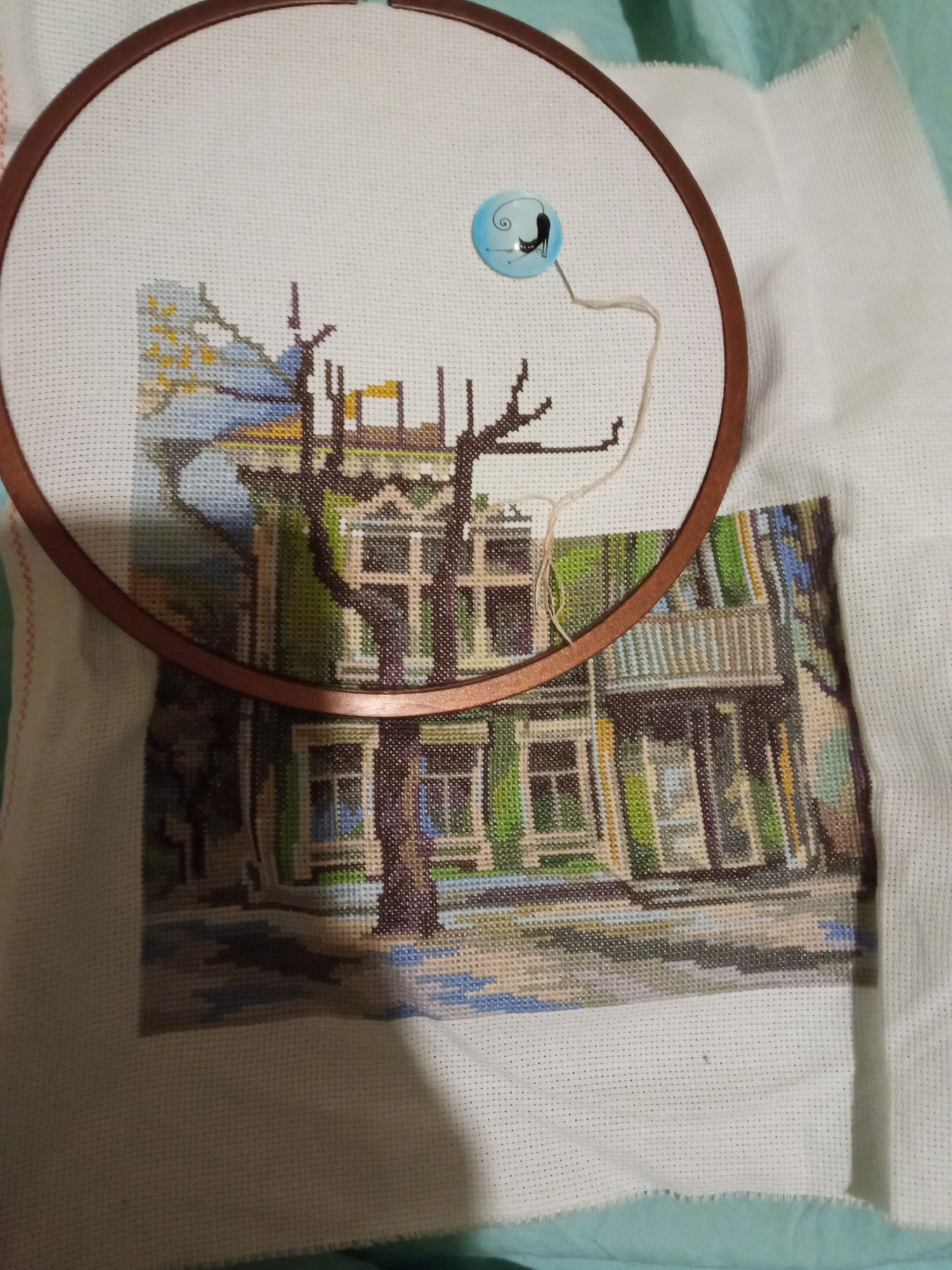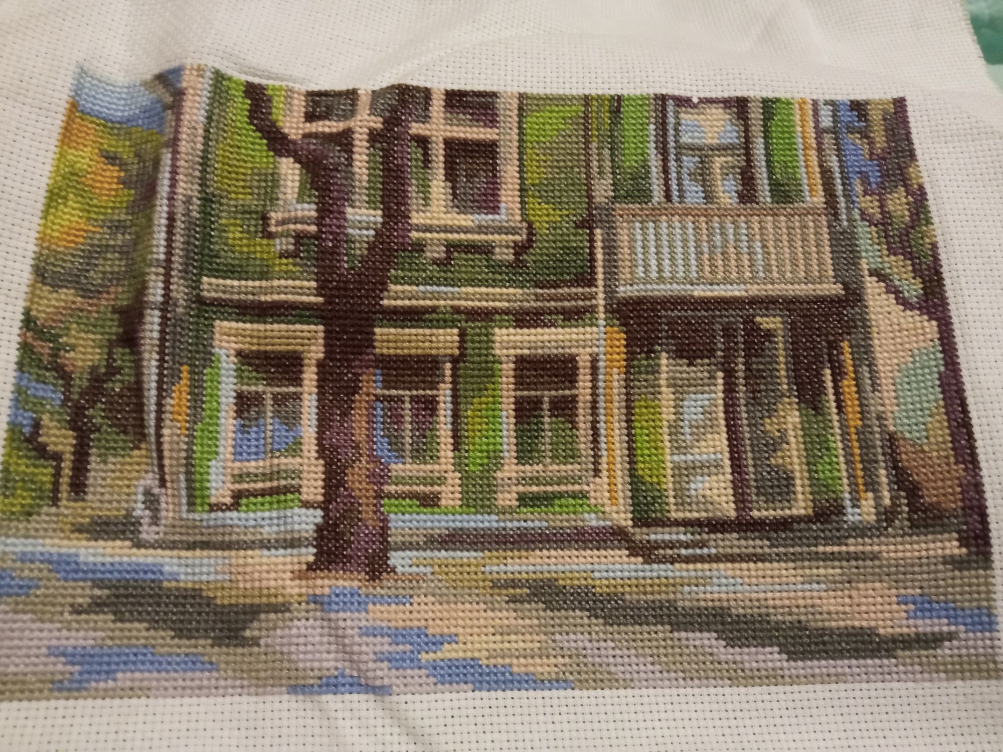 21 января 2022 Немножко ещё старого дома... Верхняя часть, в принципе, не особо от нижней отличается - те же в основном разрозненные фрагменты разных цветов. Но здесь ещё и дерево - и кусочки неба между ветвями смотрятся как витраж. Одно хорошо, всё-таки одноцветные участки здесь объёмнее, чем в самом доме. Даже нитку сразу можно до конца дошить))) А так пока моя цель - верхний левый угол. И потом ещё немного продвинуть какой-нибудь ДИМ Сибирская Кошка, Аринесса , Egelia и 14 других сказали спасибо Поделиться сообщением Ссылка на сообщение