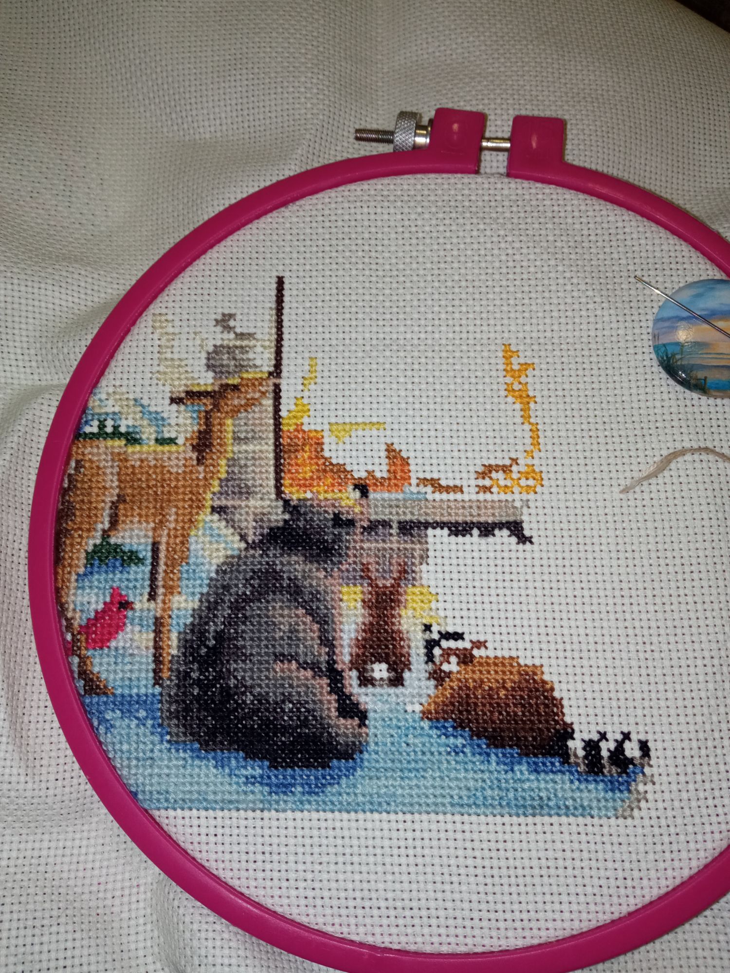 16 января 2023 Одолела-таки я 700 крестиков Эльбруса! Даже нет, не 700, а целых 730 И, скажу честно, продолжить хотела, хоть немного. Но вот незадача случилась - снова почти разрядился телефон. Трубка у меня уже старенькая по смартфонным меркам, хотя, казалось бы, относительно недавно вроде покупала... Я это к тому, что после того, как заряд опускается до 10 процентов - надо или срочно-срочно заряжать, или очень-очень экономить. Иначе довольно быстро полностью разрядится. В общем, выбрала я первый вариант - отложить Эльбрус, поставить телефон заряжаться и взять любой другой процесс с бумажной схемой. Выбор мой пал на Рождество. Вот можно сколько угодно критиковать ДИМ за "ненашесть", но факт остаëтся фактом: чего не отнять в их новогодне-рождественских сюжетах, так это доброты и волшебства. Вот насколько это тёплый и добрый сюжет, пронизанный сказочной атмосферой! Праздник прямо чувствуется, и вышивать его тоже хочется. Интересно, что цветовая гамма американского "оригинала" и перевыпуска китайской сборки отличается. Сейчас такой же сюжет, только по набору американской сборки, вышивает Ника makalicha1970, можете посмотреть у неё в теме или в гаечке и сравнить. Разница голубых оттенков снега видна сразу. В американской сборке - морозная синева, в китайской - яркость, чуть ли не бирюза. И превью набора американской сборки и в нашей базе сайта тоже морозно-синее, а в перевыпуске - ярко-голубое, как и в отшиве по нему. Не скажу, что какая-то версия лучше или хуже, каждая выглядит по-своему замечательно, и отшивы по перевыпускам прекрасны! Даже, пожалуй, выглядят за счёт "повышенной" яркости более нарядно, празднично. Но вот мне всё же ближе американская "версия", хотя хорошо уже то, что набор перевыпустили, и рада даже одному этому факту. Каори, Сибирская Кошка, Полли и 11 других сказали спасибо Поделиться сообщением Ссылка на сообщение