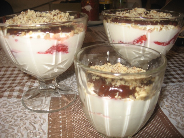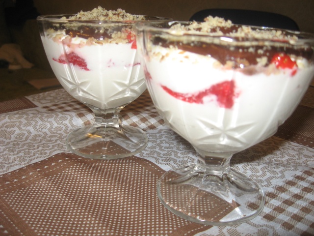 Далее берем фрукту или ягоду,в оригинальном рецепте-консервированный персик,я брала клубнику и .. :rolleyes:вкладываем в креманку или стакан половину взбитой массы затем ягоду или фрукту затем снова взбитую массу,потом на водяной бане топим плитку шоколада со столовой ложкой сметаны и выливаем жидкий горячий шоколад сверху,можно украсить листочками мяты или дробленным грецким орехом,а по сути чем угодно.Получаеться очень вкусно и полезно-делала восновном старшему сыну и он благодарно умял :rofl: