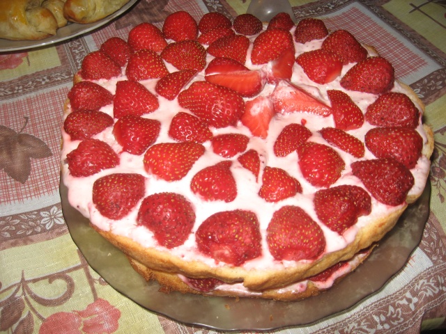 Бисквит вынуть из духовки,дать остыть,разрезать вдоль на 2 коржа,рыхлую сторону щедро промазать кремом и выложить ягоды,сверху положить второй корж рыхлой стороной кверху и так же промазать кремом и выложить ягоду.Можно использовать любые ягоды и фрукты по желанию(у меня сейчас клубника),а так же на ягоды делать желейный слой-но у меня на желе не было времени,к тому же бисквитик и так хорош :good: