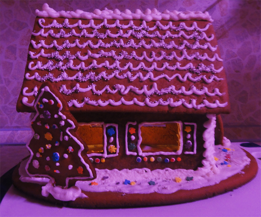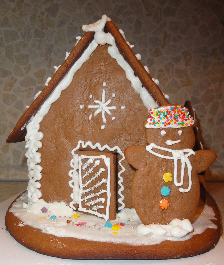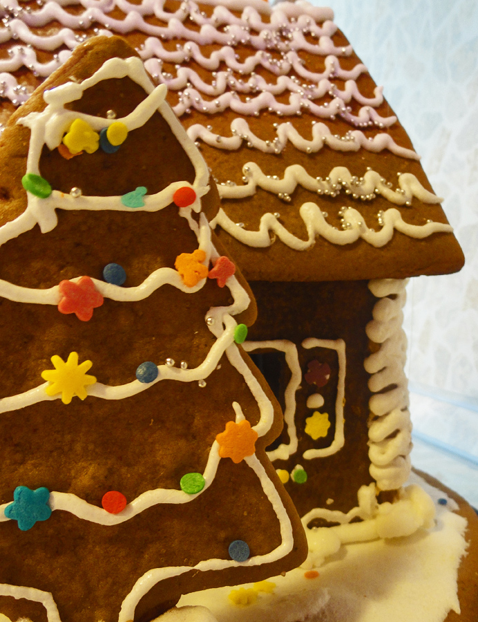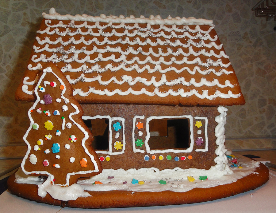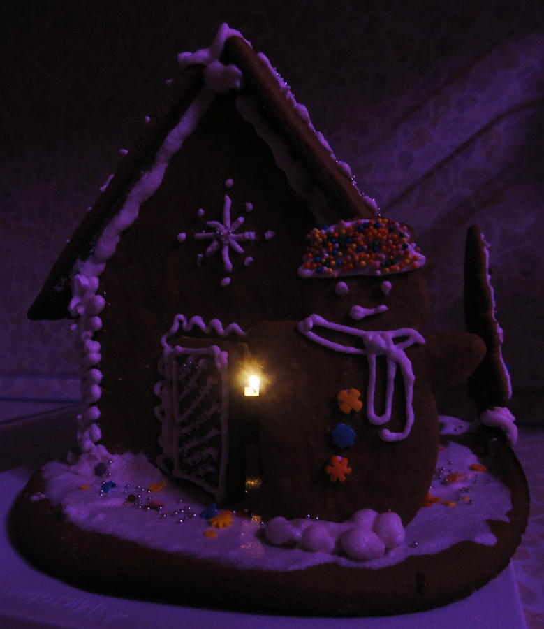 Мой домик размерами 18х9см. Но лучше бы я сделала 2 маленьких с толстенькими стенками =) Маленький домик можно склеить той же помадкой, большой лучше склеивать карамелью (просто сахар растопить). Неровности стыков можно подровнять на терке или подпилить ножом. Свой домик склеивала на карамель. Если есть силиконовый коврик для выпечки, то можно в окошки насыпать колотых леденцов, они растекутся и будут цветные стеклышки. Если противень обычный, то подстилать бумагу для выпечки, но лучше все это делать на тефлоновом. Проверяла оба способа, второй понравился больше. Украшать как душе угодно, можно с мармеладом, конфетами, посыпками и т.п.