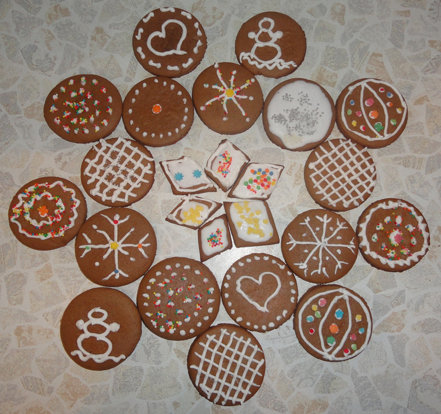 1 - Пряники. Тесто раскатывать не тонко. Нарезать формочками или стаканчиком, как испекутся украсить как душа желает.