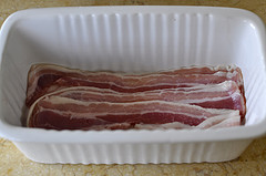 В длинную квадратную форму выкладывает тонко нарезанную грудинку (я сделала ошибку и купила ненарезанный кусок, и как понимаете, сама порезать тонко не смогла((( )