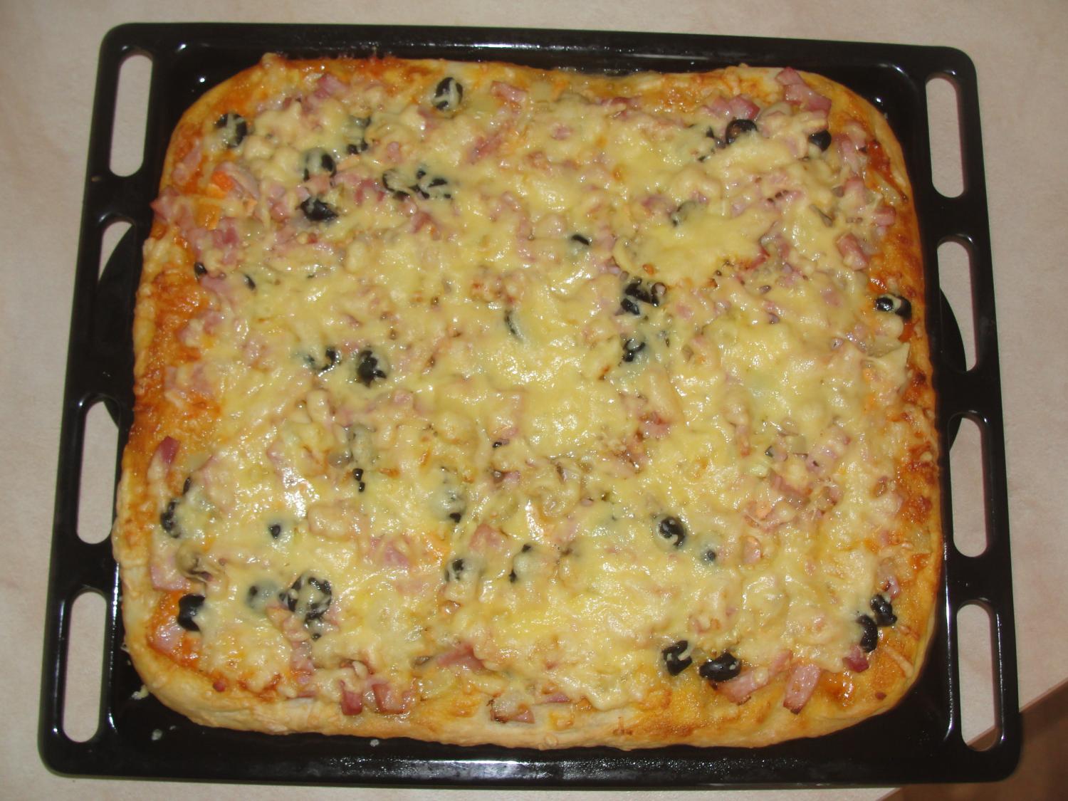 Приготовление:Лук нарезать мелко, спассеровать на масле. Ветчину нарезать тонкими полосками. С шампиньонов слить воду. Перец нарезать кубиками или соломкой. Маслины порезать пополам. Соединить ветчину, шампиньоны, перец, спассерованный лук и маслины. Перемешать.Тесто раскатать на противень или большую сковородку, смазать соусом из томатной пасты и майонеза. Поверх выложить начинку и посыпать сыром (натертым на крупной терке).Выпекать около 20 минут, при температуре 160-170С, в предварительно разогретой духовке.