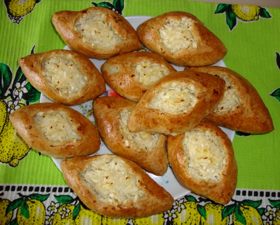 Далее - лепим открытые пирожки в форме лодочки, укладываем на противень, смазываем яйцом и выпекаем при 180 градусах до аппетитного румяного-золотистого цвета. К пирогам подается в пиале или креманке растопленное сливочное масло, на каждый горячий пирожок надо налить чуть меньше чайной ложки маслица (я этого не делаю, так как фигура-с портится-с) и употребить с удовольствием!