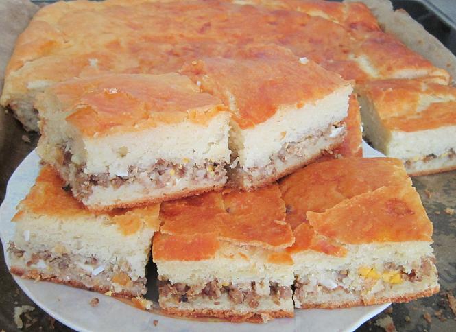 Теперь тесто. К сожалению рецепт не сохранился, когда бабушка умерла, моей подруге было лет 10-12. В этом возрасте она еще не заботилась о семейном наследии и традициях, о чем теперь очень жалеет. Единственное, помнит, что тесто было бездрожжевое. Экспериментальным путем мы пришли к варианту, который я привожу: 100г размягченного масла или маргарина перемешать руками с 2-мя стаканами муки. Добавить 1 стол. ложку сахара, щепоть соли, 1 ч.л. соды, 100г сметаны, 2 яйца. Вымесить тесто, чтобы не прилипало к рукам. Для этого постепенно добавляется еще стакан муки или чуть побольше.