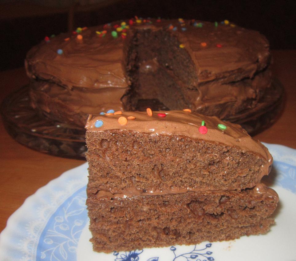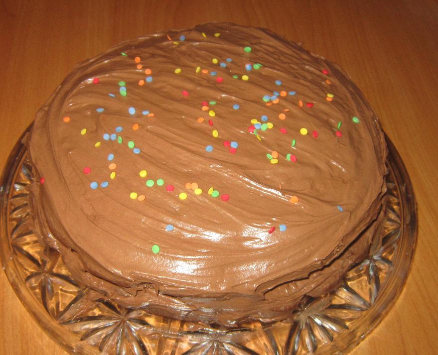 Тесто : 3 яйца, 1 ст сахара, 0.5 б. сгущенки, 1 ч.л. соды + 1 ст. л. уксуса., 3 ч.л. какао, 1,5 ст. муки.