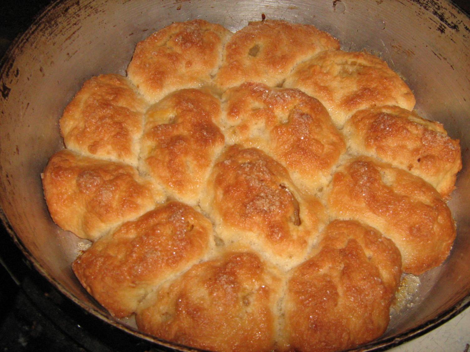 Я делала 2/3 нормы, и взяла 2 больших яблока, порезанных на 8 частей. И яблоки тоже хорошо бы в сахаре обвалять. И выпекала целый час, и можно бы еще немного снизу добавить.
