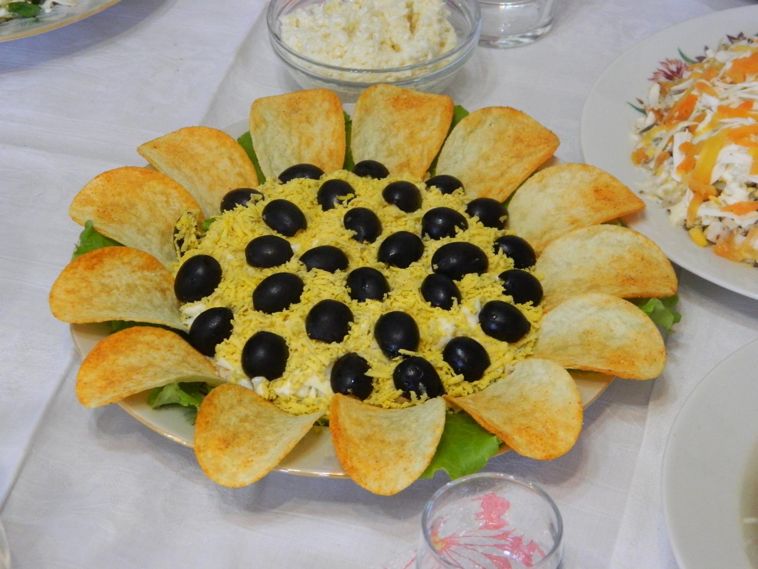 Салатики к праздничному столу.post-8913-1381423316_thumb.jpg Подсолнух! 6ООгр куриное филе (я беру готовое,копченое) 200гр грибы маринов. 3 яйца 150 гр сыра маслины без косточки чипсы майонез.Уложить на листья салата слоями,перемазывая каждый майонезом:филе кубиком,грибы маленькими пластинками,белки на крупную терку,сыр на терку,желтки на терку.Украсить половинками маслин и чипсами.Майонезом поливаю так:кладу 2 ст.ложки в п\э пакетик,закручиваю и делаю дырочку зубочисткой(слегка касаясь)и делаю густую сеточку.