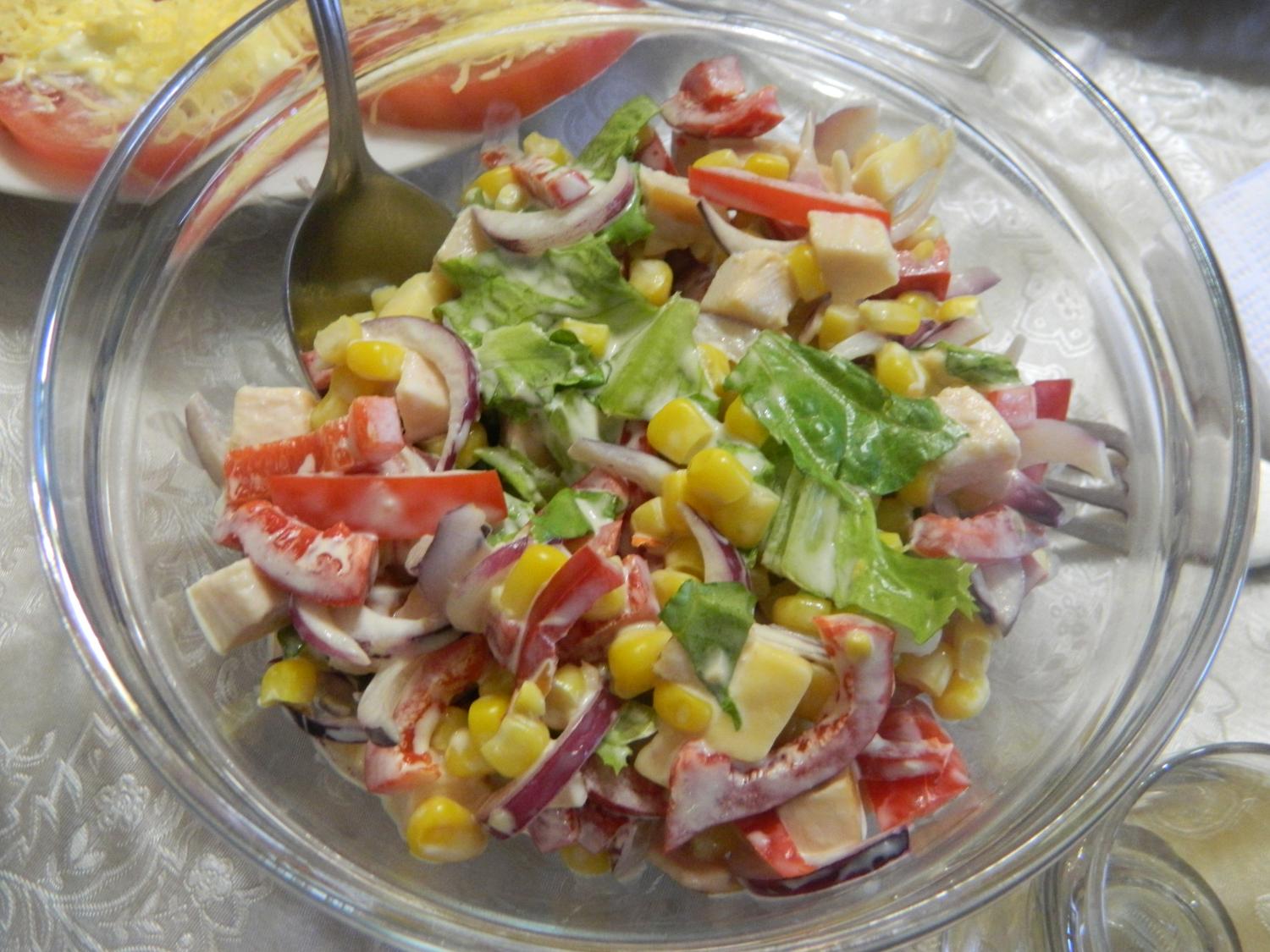 post-8913-1381424868_thumb.jpgЭтот салат нравится своим внешним видом.Яркий,легкий.Красный болгарский перец,синий сладкий лук(можно замариновать),сыр твердый,куриную грудку. порезать все соломкой.Банку кукурузы.лист салата порвать руками.посолить ,добавить майонез (немного),перемешать.