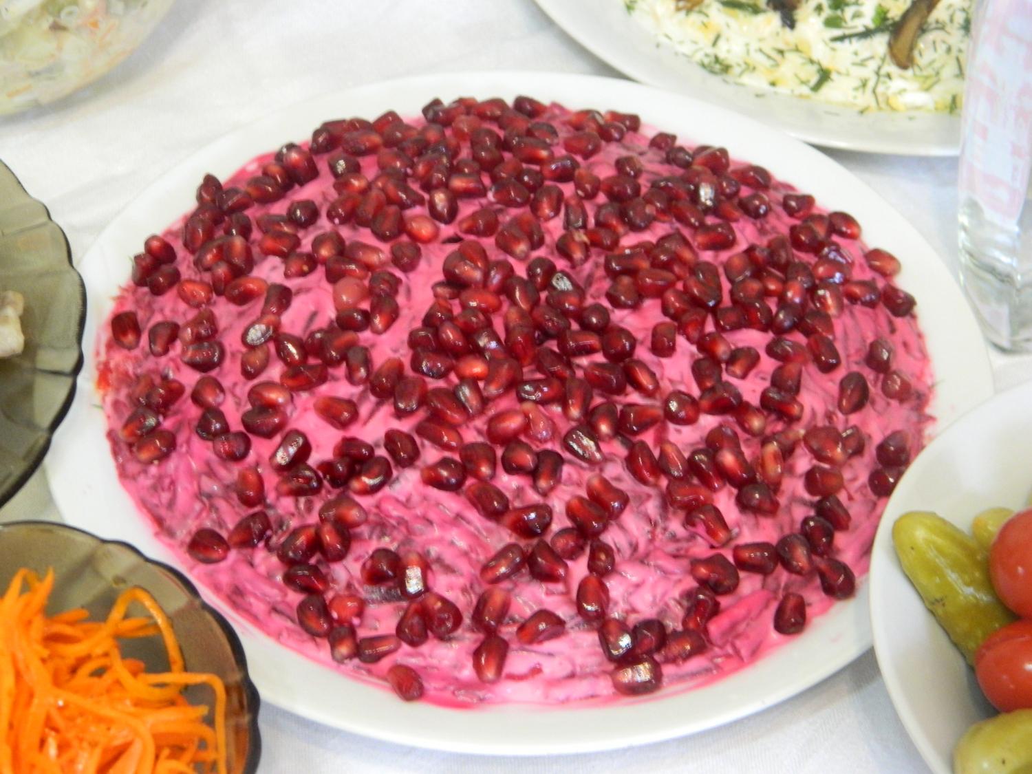 post-8913-1381425860_thumb.jpg Этот салатик посерьезнее,с картошкой.На блюдо уложить слоями,перемазывая майонезом :вареную свеклу натертую на крупную терку,морковь так же,картофель,мясо любое порезанное мелким кубиком,маринованный лук,яйца кубиком,снова морковь и свеклу.смазать все майонезом и посыпать зернами граната или красной смородиной.с гранатом вкуснее!За столом следить ,чтоб гости не выковыривали зерна :lol: ,в них самая суть!Косточки вообще не чувствуются,сама удивилась.Слои делаю тоненькие,чтоб только прикрыть предыдущий.так и пропитывается лучше,да и не люблю я ,когда по 2см картошки и морковки.