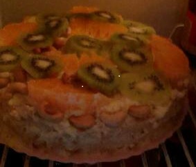 Взбить белки с сахарной пудрой.Пудру нужно добавлять по вкусу,постараться чтобы не было очень приторно.Добавить размягчённое масло,сыр маскарпоне,коньяк.В хорошо взбитый крем добавить по желанию орехи(я брала кешью). Корж смазать хорошим слоем крема,я ещё прокладывала кусочками фруктов(киви).По поводу фруктов- я брала не слишком сладкие фрукты,чтобы не было у торта слишком приторного вкуса.А так кто какие любит))) Ну вот.. на смазанный корж кладётся следующий и тоже смазывается и прокладываеся,самый верхний корж тоже хорошенько намазать и бока торта и всё украсить фруктами,шок. крошкой,орехами всё по желанию и вкусу.Вся эта готовая красота должна часа 2-3 постоять и пропитаться (я делала на ночь,поэтому убрала в холодильник через часок).Торт получается вкусный и ну очень сытный!Зная о его сытности(подружка предупредила) подала я его в начале празднества под чаёк-кофеёк пока мужчины шашлык жарили.