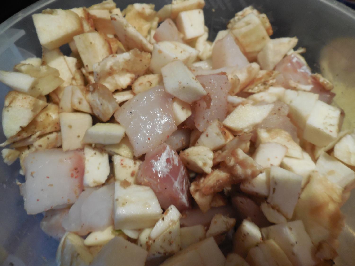 Рыба-любая- филе, туда же середки баклажан,