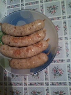Не сложно, вкусно и натурально. Нужно мясо (есть варианты: свинина-говядина, курица, свинина-индейка), сало, соль, специи, чеснок, черева свинная. Купить оболочку в наше время не составит труда. В интернете продают. Я сначала купила 30 метров, но с нашими аппетитами оказалось мало, затем купила 90 метров на год. Рецепт напишу по вчерашним следам приготовления. На рынке был куплен кусок свинины по домашнему (окорок) около 1,5 кг, кожу срезаем, сало срезаем откладываем в сторонку. 1,2 индейку филе (обычно беру говядину, но ее не было). Свинину перемалываем, сало и индейку режем 0,5Ч0,5 см или 0,7Ч0,7 см. Перемешиваем, добавляем соль, специи, чеснок и воду, что бы фарш был мокрым. Набиваем череву не плотно, делаем дырочки зубочисткой. Далее я бланшерую их мин5 в кипящей воде и в духовку. Получаем вот что