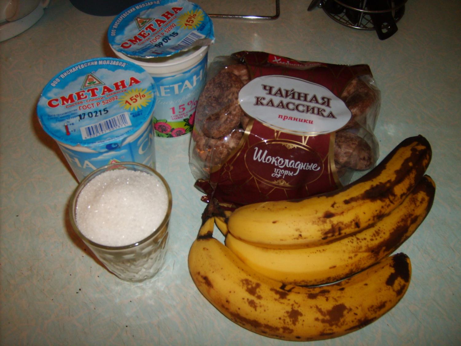 Понадобится 500г шоколадных пряников (свежайших), 3 банана, 600г сметаны 15% и 1 стакан сахара.post-14932-1424253114_thumb.jpg
