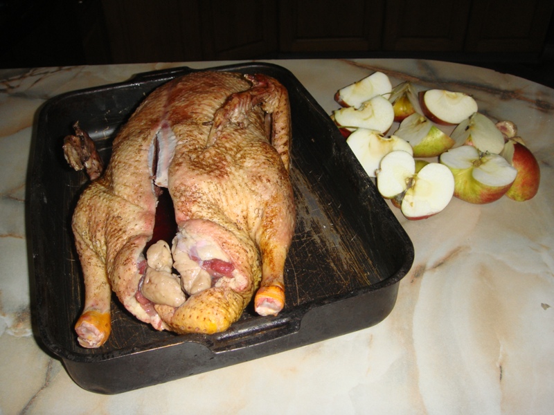 Ой девчонки,вся птица готовится очень легко,натирается солью чесноком и перцем,затем стоит около часа,во внутрь яблоки большими кусочками и на маленький огонек в духовку,готовилась эта пернатая около 3 часов.,периодически поливая жирком ,который образуется.......за час до готовности накрыть фольгой....