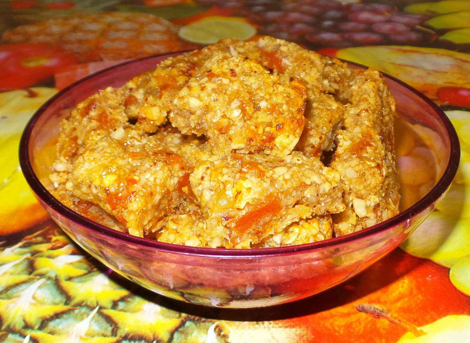 берутся разные сухофрукты по вкусу и без косточек - чернослив,финики,курага,вяленая клюква,изюм... перемалываются в блендере.