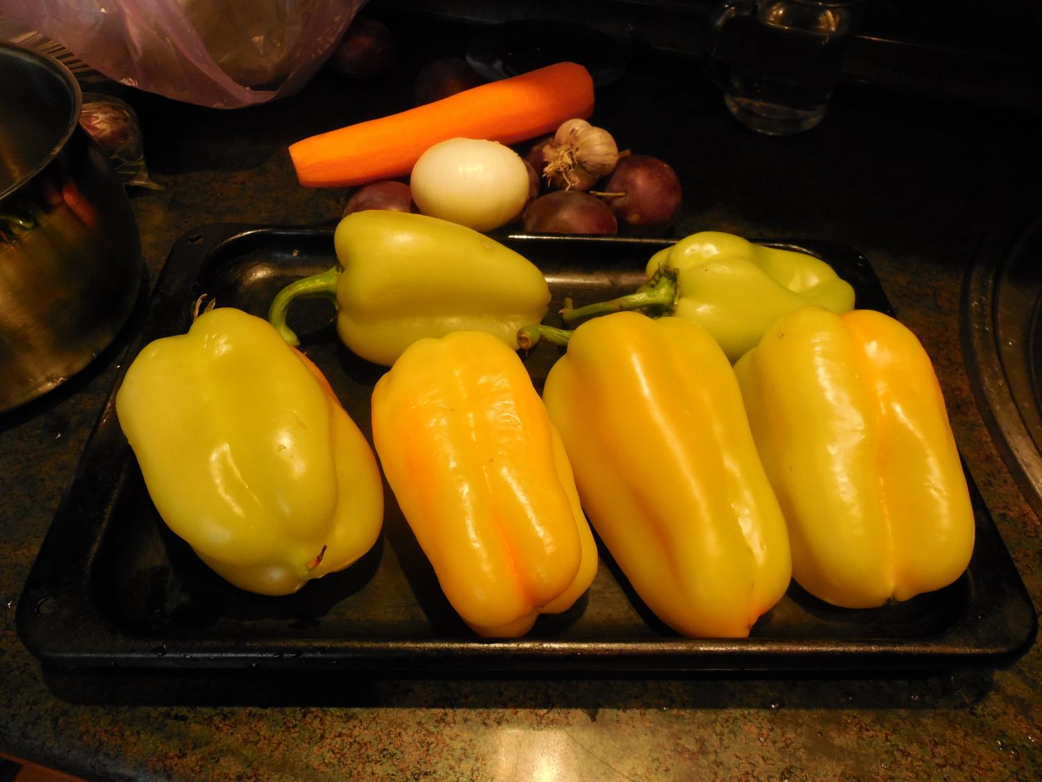 12 больших перчин вымыть не удаляя плодоножку обмазать подсолнечным маслом и разложить на притивень на пергамент. Запекать 15 мин. при
