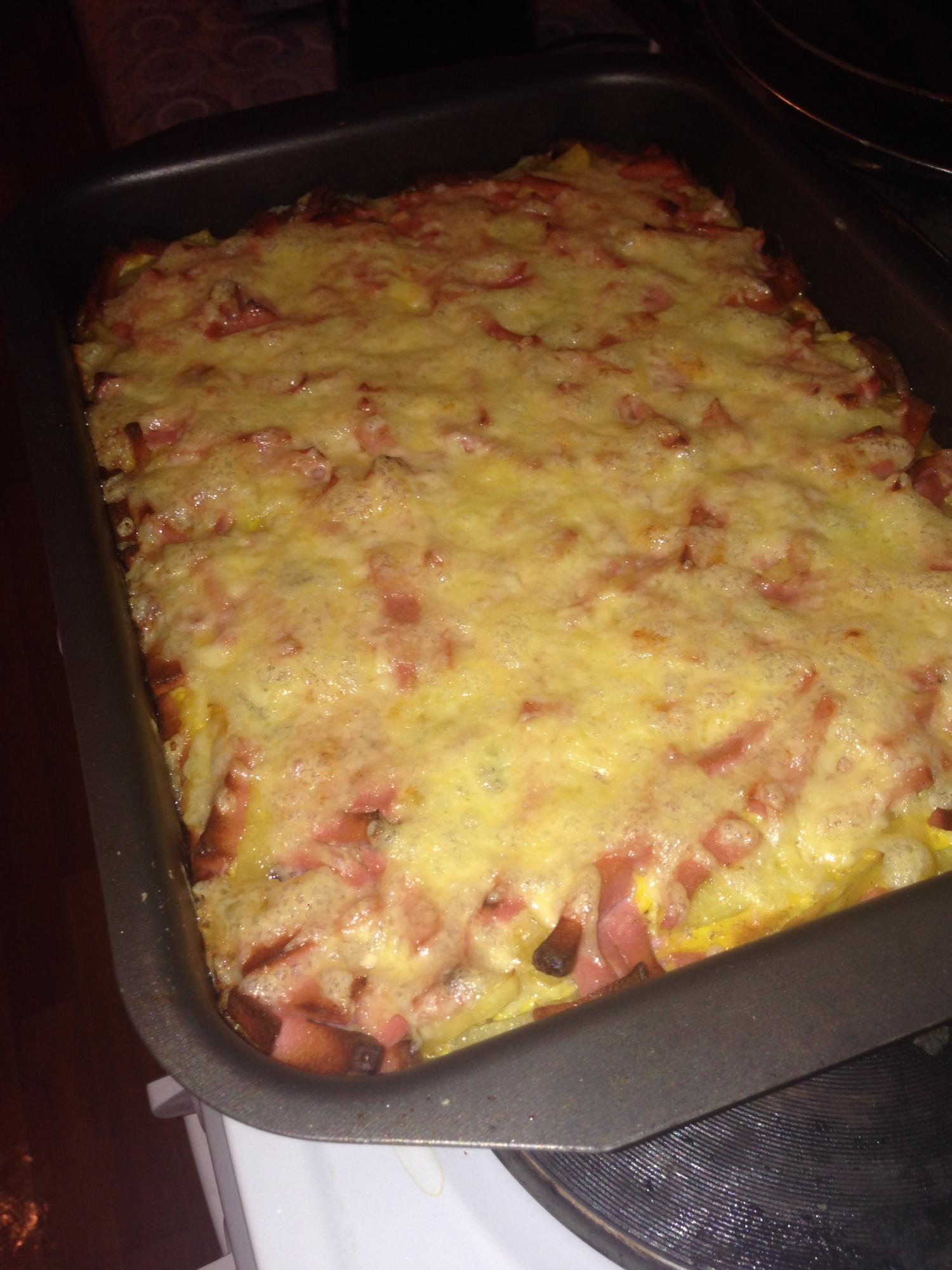 Ветчину (колбасу) нарезаем соломкой. Выкладываем поверх картофеля в форму.