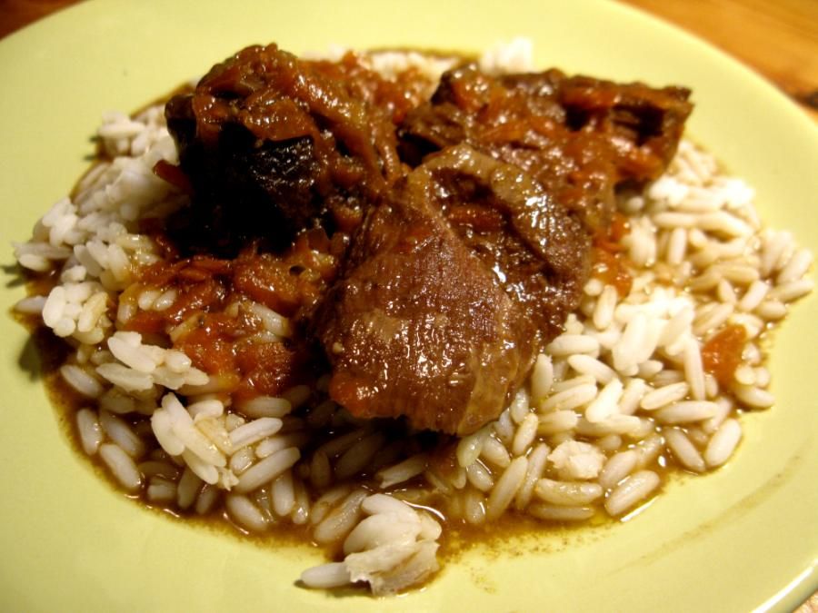 На блюдо высыпать сваренный рис, сверху выложить мясо вместе с  соусом!