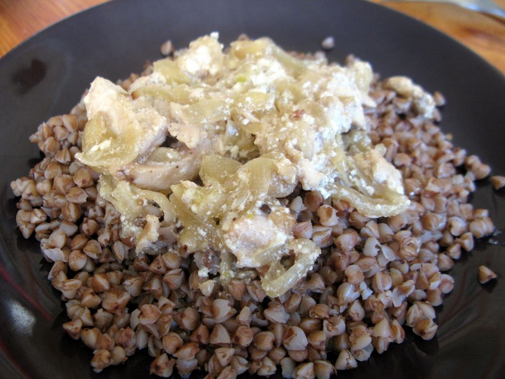 Индейку и лук отправить в казан (кастрюльку), добавить сметаны (у меня было индейки примерно 600 г, 4 луковицы, 2 большие полные ложки сметаны). Потушить на слабом огне минут 20-30.  Воды я не добавляла.