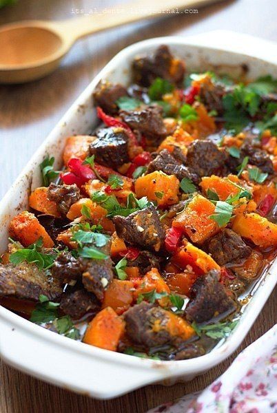 2. В  форму выкладываем половину овощей, затем мясо, и вторую половину овощей. Каждый слой посыпаем измельченным чесноком и солим по вкусу. Накрываем фольгой и отправляем в разогретую до 180 градусов духовку где-то на час. Перед подачей посыпаем рубленой зеленью.