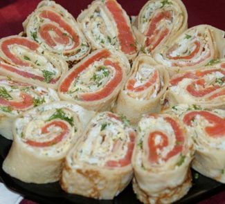 Взять тонкий лаваш, намазать плавленным сыром, выложить кусочки слабосоленой семги, посыпать зеленью, свернуть рулетом, нарезать на кусочки и разложить на тарелке. Быстро, вкусно, красиво!