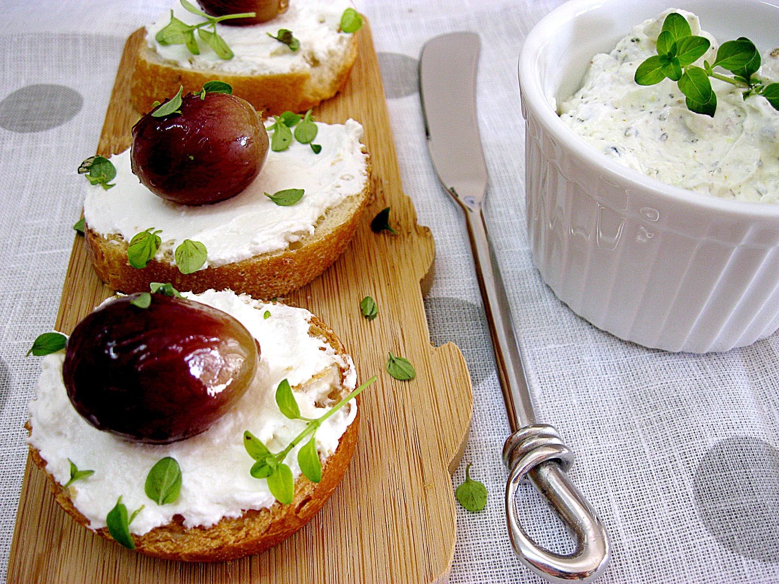 а если есть возможность купить веточку винограда и запечь ее в духовке минут 20-30 ,то можно  разложить по виноградине сверху для красоты. У запеченного винограда очень интересный вкус, для меня это стало открытием года. На фотке - просто отвешанный йогурт и подсушенный багет