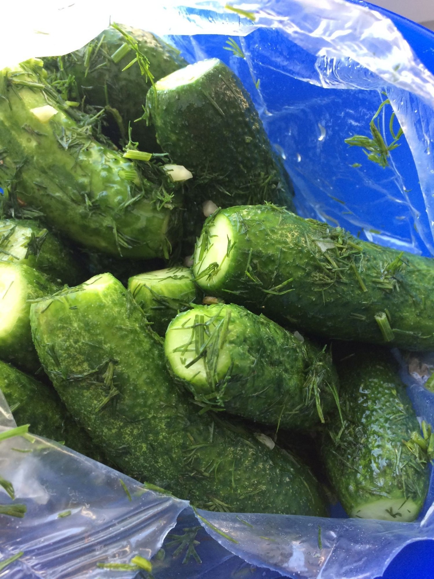На 4 часа замочить огурцы.   В пакет закинуть все, туго завязать, взболтать. В холодильник. Все.