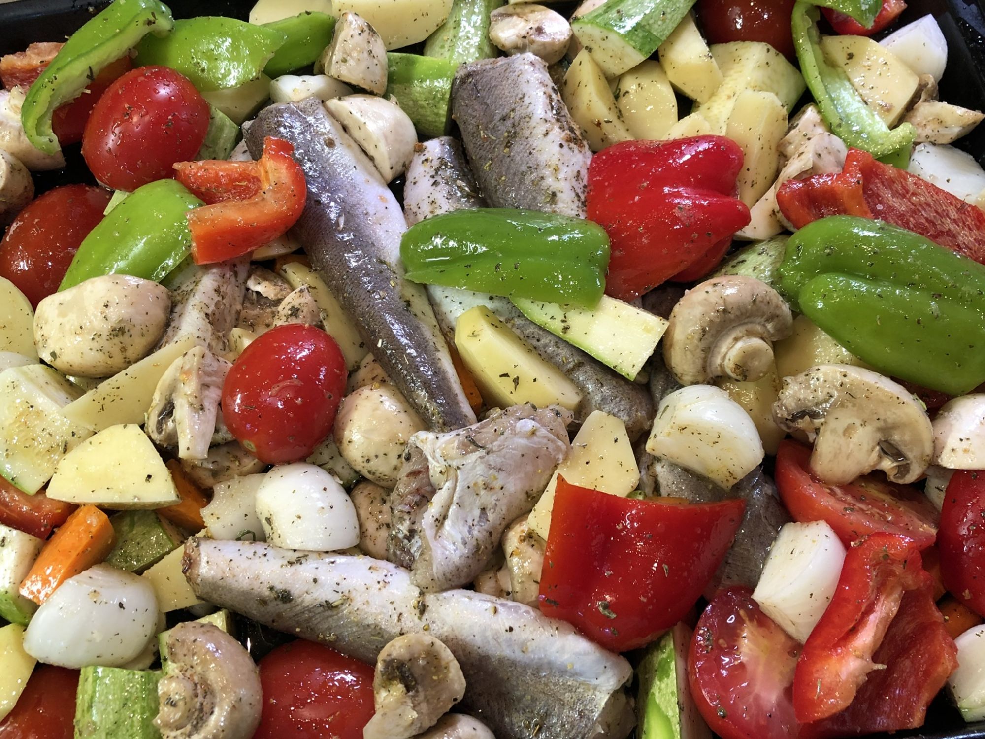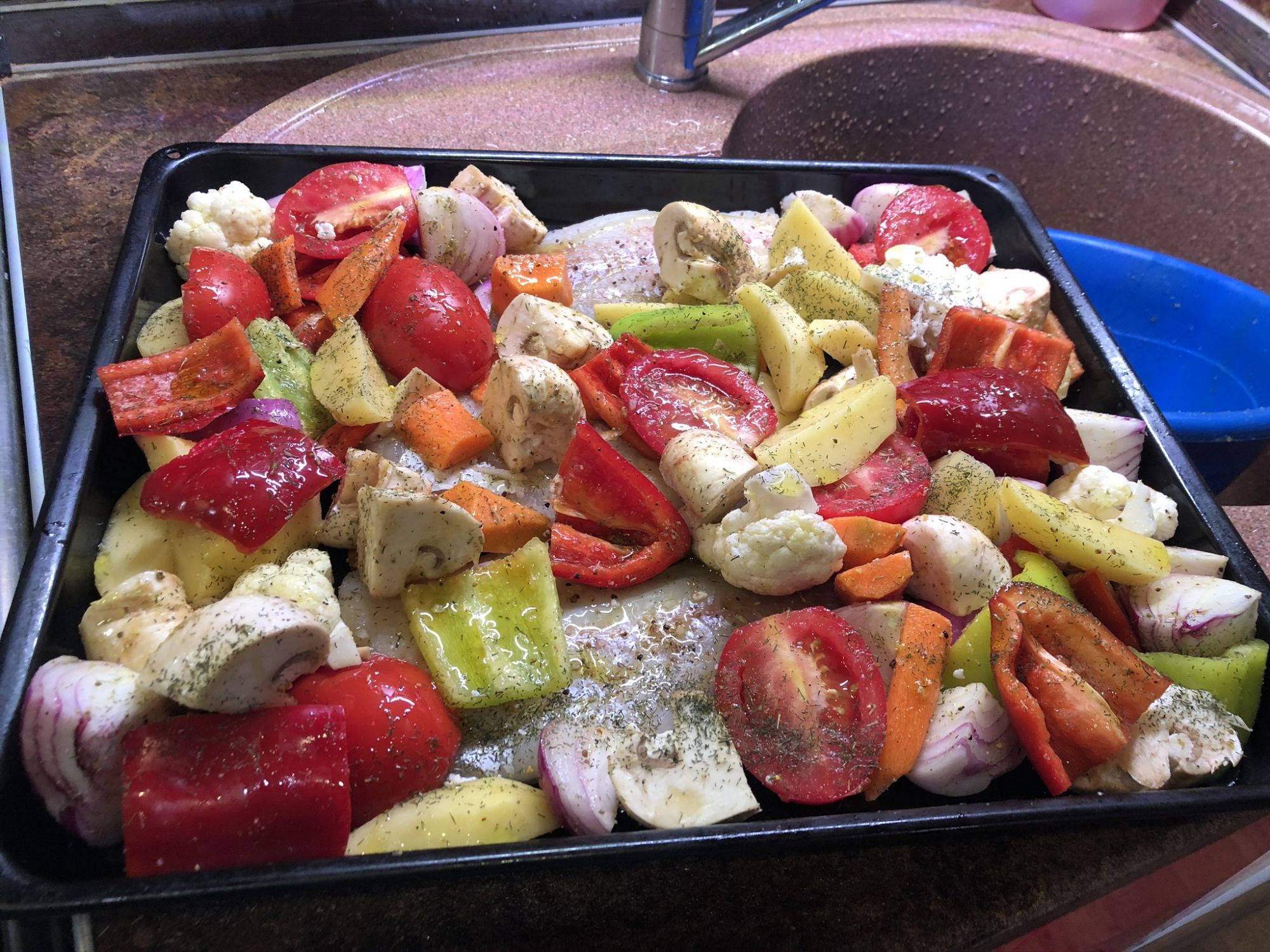 Одновременно в духовке и тоже под фольгой готовлю гарнир - порезанный крупными кусками картофель, лук (для любителей), морковь и болгарский перец, аналогичным образом сбрызнутые маслом и смешанные с приправами.