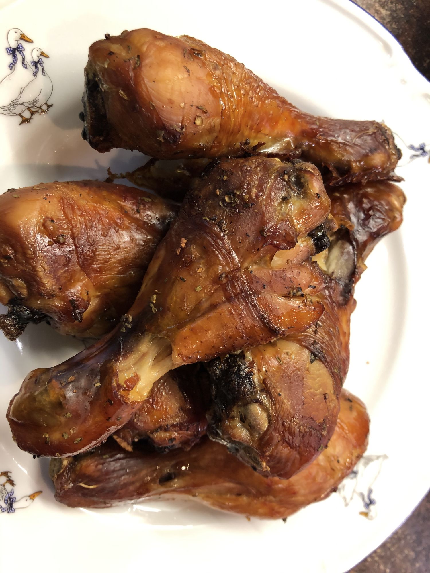 Обычно с вечера мариную в специях голени индейки и ставлю в холодильник, а утром готовлю. Голени нужно положить в ёмкость, всыпать по вкусу соль, перец и любимые приправы  - у меня обычно орегано, розмарин, сушёные ягоды жимолости, куркума, давленый чеснок. Далее чуть сбрызнуть растительным маслом и перемешать, с маслом приправы равномерно распределяются по голеням. Можно все то же самое сделать непосредственно перед готовкой. Голени уложить в глубокий противень, запечатать его плотно фольгой и поставить в духовку на 180-200 градусов, запекать до готовности мяса (чем дольше мясо томится под фольгой, тем оно нежнее, разумеется). Когда мясо готово, убрать фольгу и подрумянить ещё 3-5 минут на 200-250 градусах. Но тут важно не пересушить мясо!