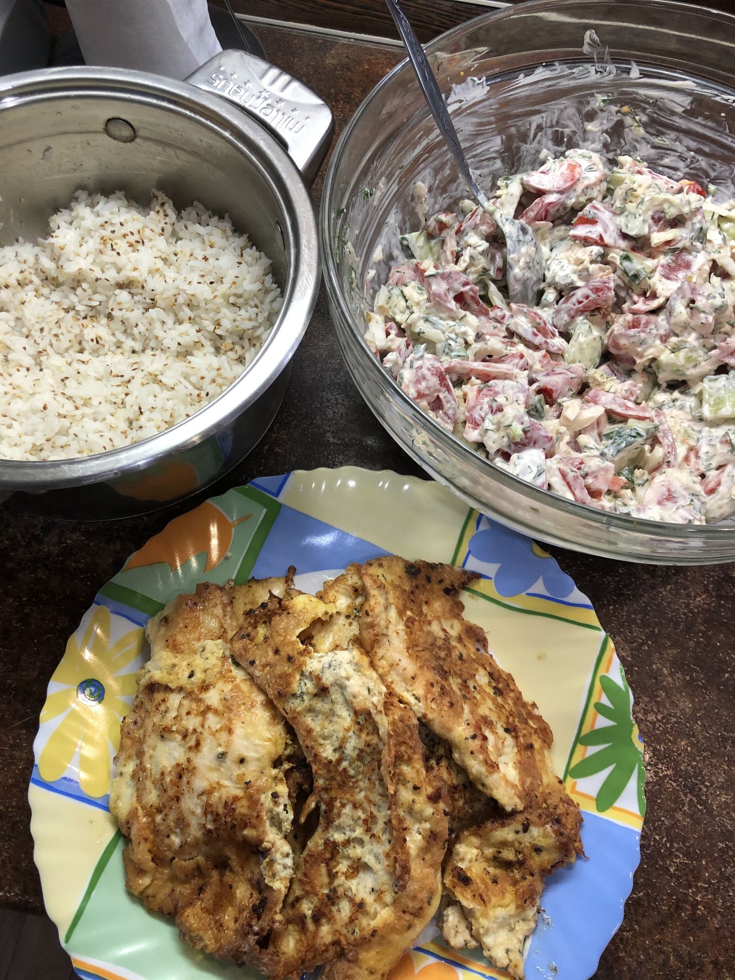 все быстро просто и вкусно - рис с маслом и кунжутом , куриные отбивные в яйце и салат .