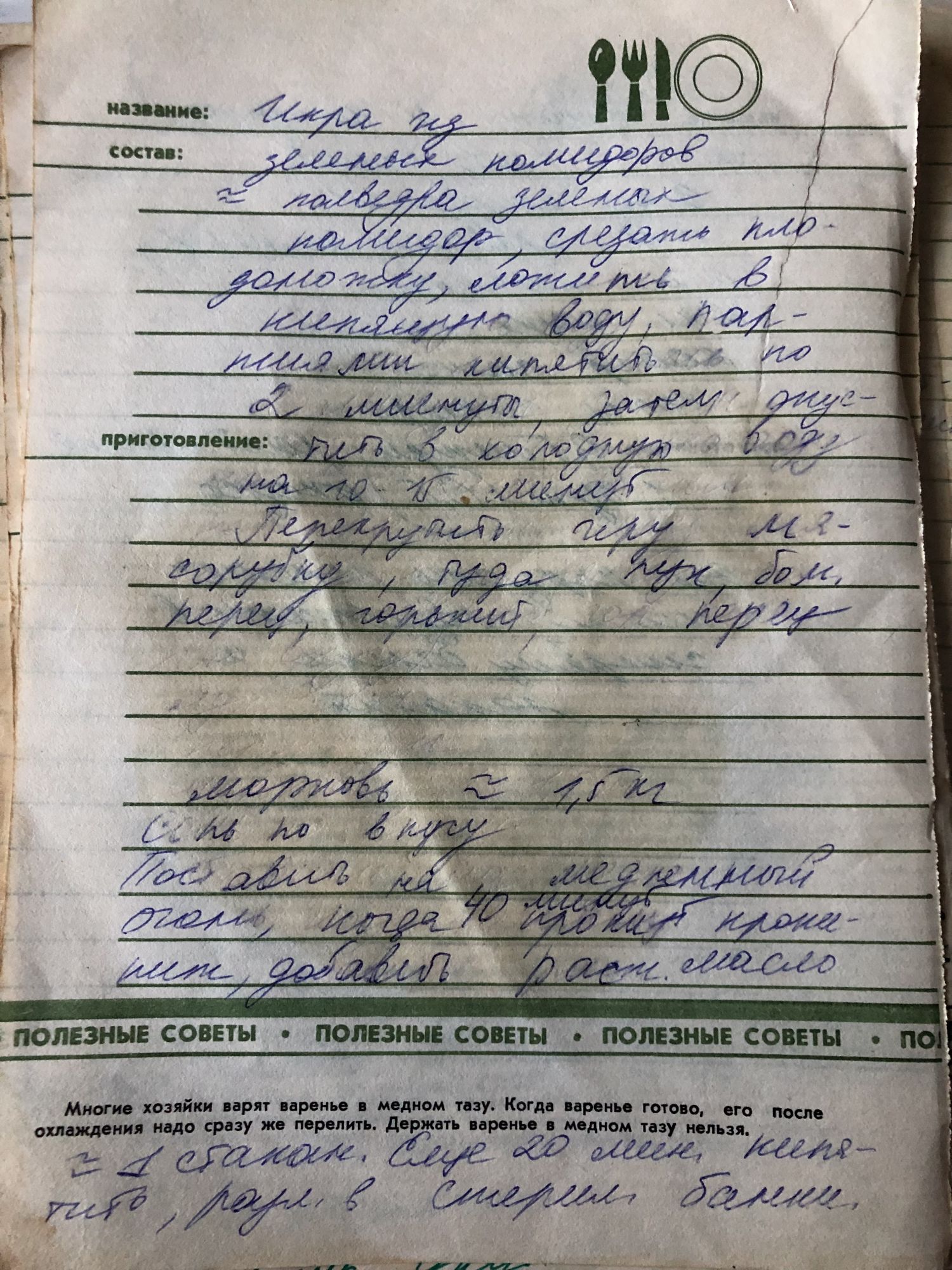 Юнона , нашла в древних записях . За качество сорри … сама делала , но давно . Рецепты старые советские . В икре часть текста утеряна , так и не разобрала , но там и так интуитивно понятно .  Больше из зелёных помидор лично я никогда ничего не ела ). Ну кроме квашеных конечно .