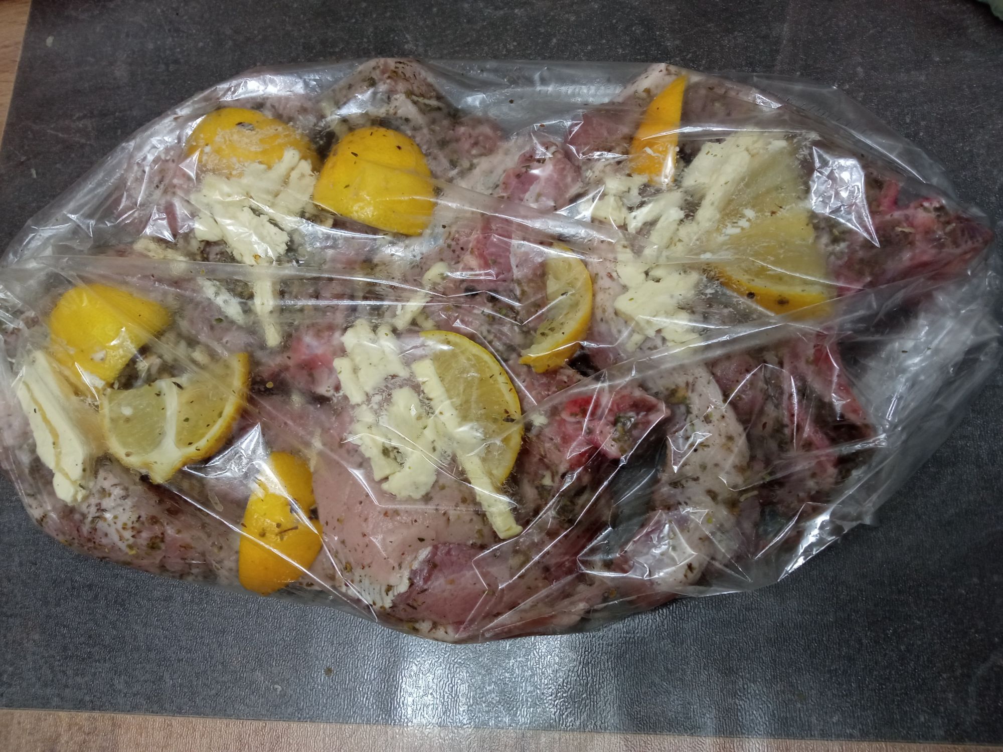 На мясе ножом делаем решётку, мажем маринадом, кладём в рукав для запекания и в морозилку. Перед праздником достаём, без лишних затрат времени в этом же рукаве - в духовку. Поскольку у меня мясо нежирное, я положила ещё на каждый кусок сливочное масло. Естественно, нужно за несколько часов из морозилки достать рукав и перед тем, как поставить запекать, или в процессе, сверху проткнуть. На фото мясо со вторым маринадом.