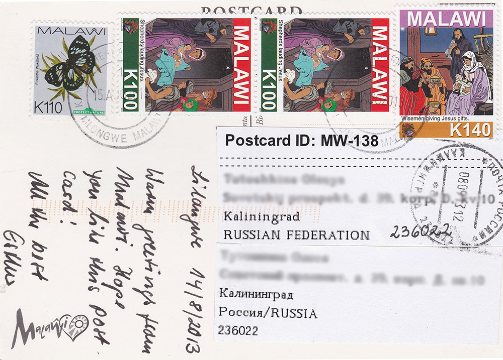 10 сентября 2013 Ольга, какие они синхронные Тоже сегодня остальные получила, спасибо большое! А еще я похвастаться пришла Получила открытку с трехзначным id Я, честно говоря, даже и не поняла откуда она, пришлось спрашивать гугл, что это за место такое Республика Малави - государство в Восточной Африке. Сибирская Кошка, sunny981, Elvica и 2 других сказали спасибо Поделиться сообщением Ссылка на сообщение