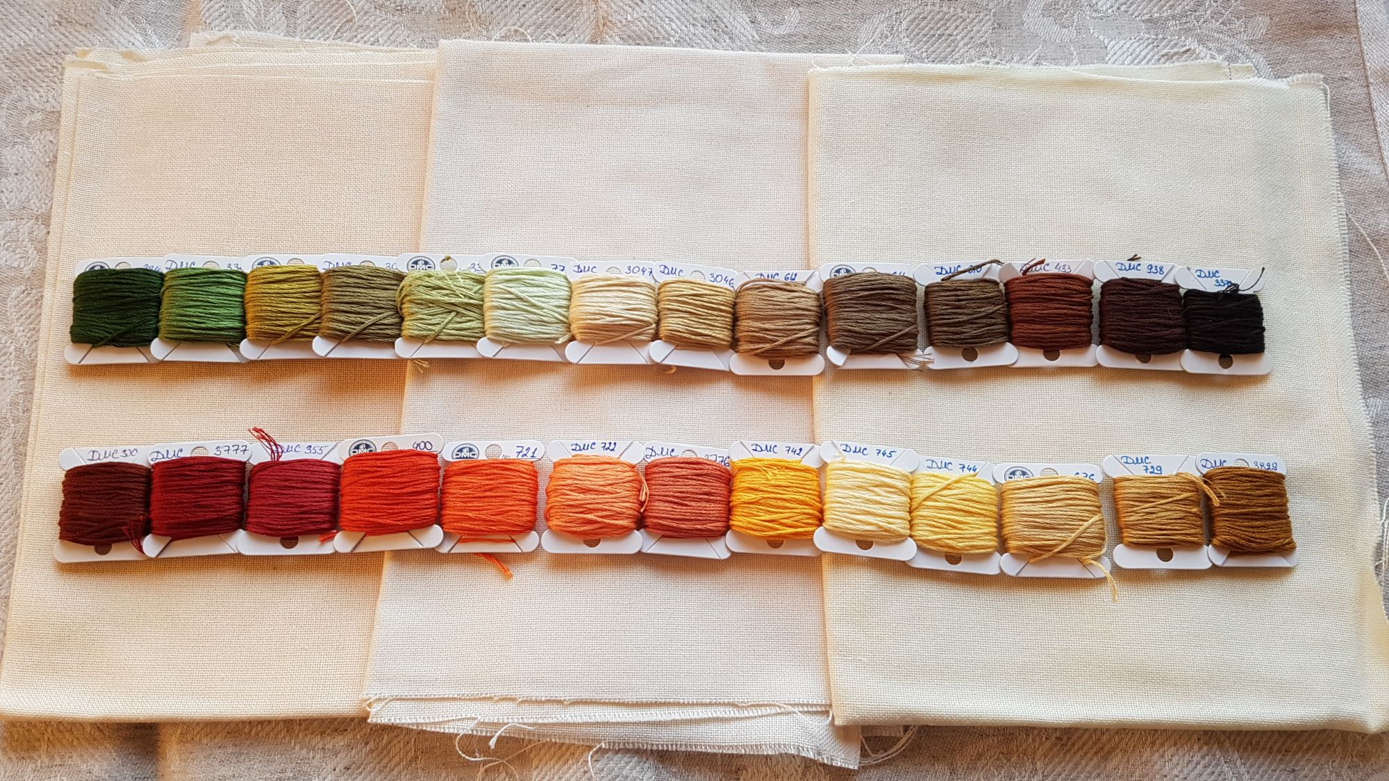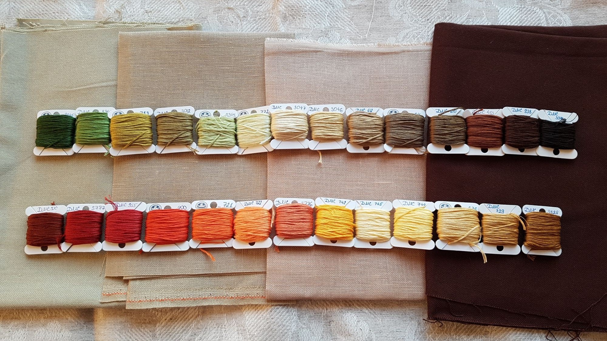 И вот цветные ткани. Крайная слеве и справа - украинская равномерка. Вторая слева - белфаст оттенок Dirty linen, третья слева - лен Пермин в оттенке Amber.