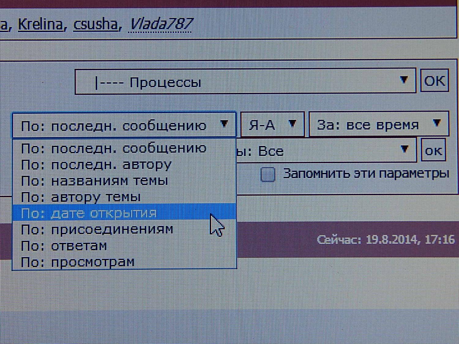 19 августа 2014 Еще у меня один вопросик, на форуме есть кнопочка "новые сообщения", удобно просматривать активные темы, а возможен поиск тем по дате их создания? Хочется не упускать новичков. Искала по количеству страниц, но есть просто темы, в которых мало пишут(((( Наташ, заходишь в процессы и внизу страницы есть окно с выпадающим списком, выбираешь "по дате открытия" и на самых первых страницах будут новые темы. Этот способ подходит для тех кто не хочет засорять почту. I_avis и LiLa сказали спасибо Поделиться сообщением Ссылка на сообщение